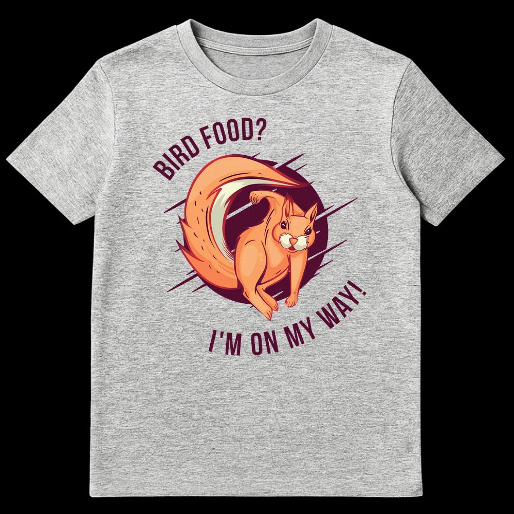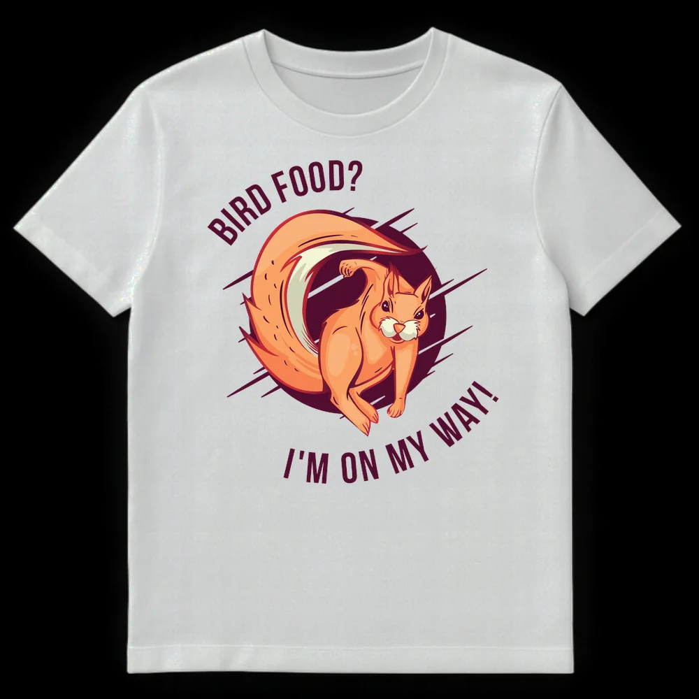 Get ready for laughs with our “BIRD FOOD? I’M ON MY WAY!” t-shirt, featuring a determined squirrel. This design hilariously captures the iconic bird feeder battle, celebrating the charming persistence of nature’s little acrobats. Perfect for wildlife enthusiasts and anyone who’s ever lost a feeder to a clever squirrel, making it an ideal funny animal lover gift.