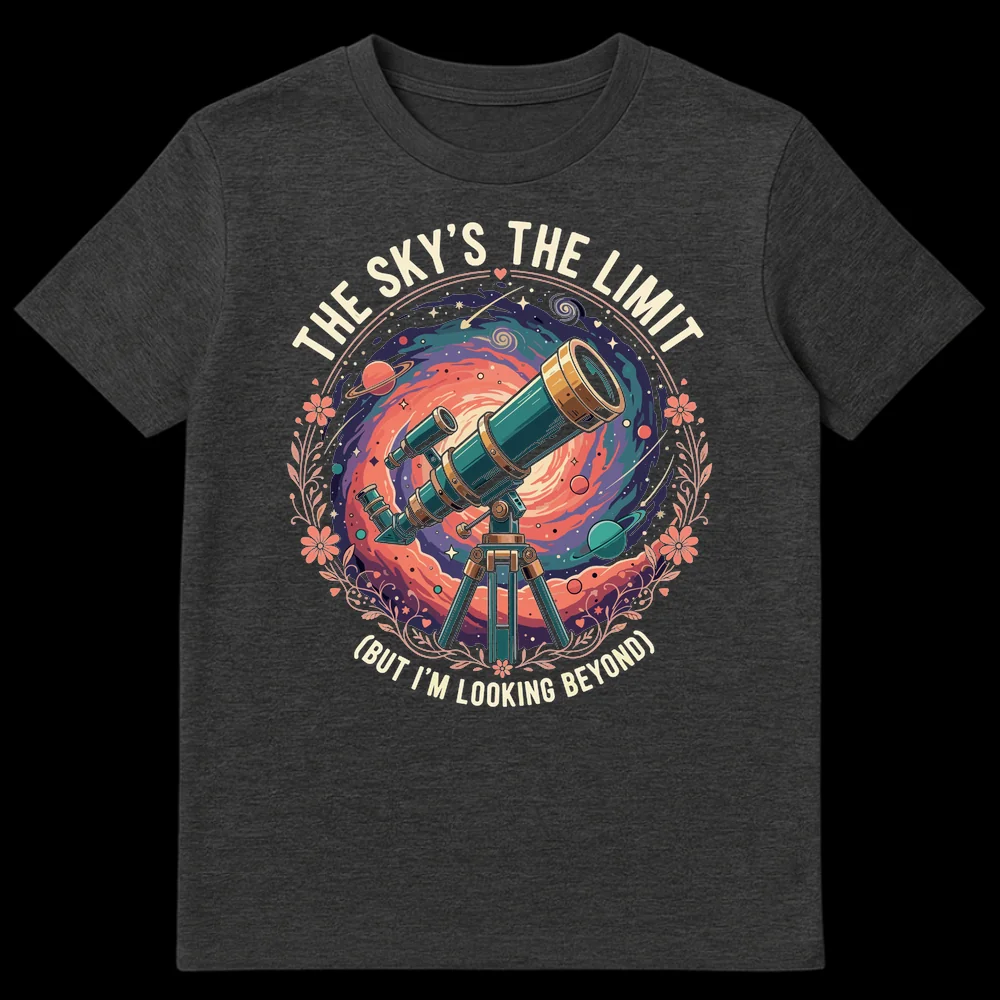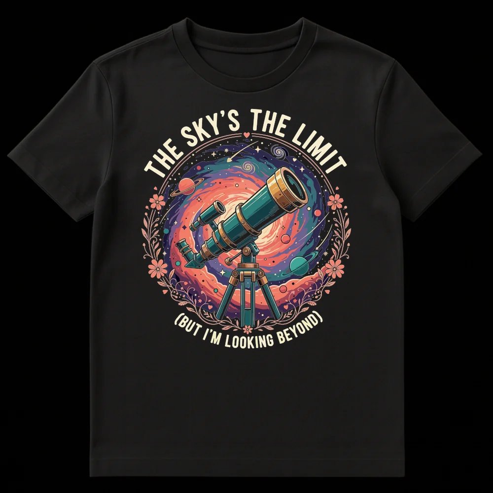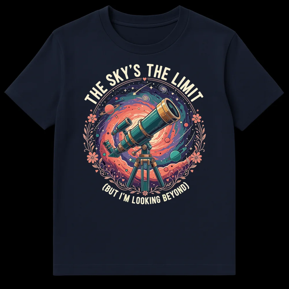 Embrace boundless ambition with our “THE SKY’S THE LIMIT (BUT I’M LOOKING BEYOND)” tee. This design features a vibrant telescope peering into a swirling galaxy, perfectly illustrating the clever wordplay about transcending conventional boundaries. It’s an inspiring statement for dreamers, space lovers, and anyone who aims high. Makes an ideal gift for astronomy enthusiasts and aspiring adventurers.
