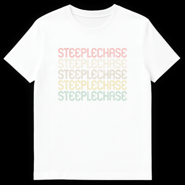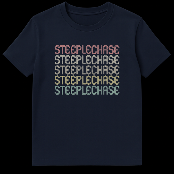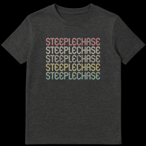 Celebrate your passion for steeplechase with this unique retro-inspired t-shirt. Featuring the word “STEEPLECHASE” repeated five times in a distressed, multi-line font with a faded, vintage color palette, it’s a stylish nod to the classic sport. Perfect for equestrian racing fans, track & field athletes, or anyone who appreciates a nostalgic sports aesthetic.