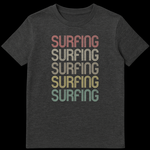 Embrace the endless summer with our unique Surfing t-shirt. Featuring the word “SURFING” repeated five times in a stacked, retro-inspired distressed font, this design captures the timeless spirit of the waves. Its vintage aesthetic and warm color palette make it a perfect statement for anyone passionate about surf culture. This tee is an ideal gift for surfers, beach enthusiasts, or anyone who cherishes nostalgic summer vibes.