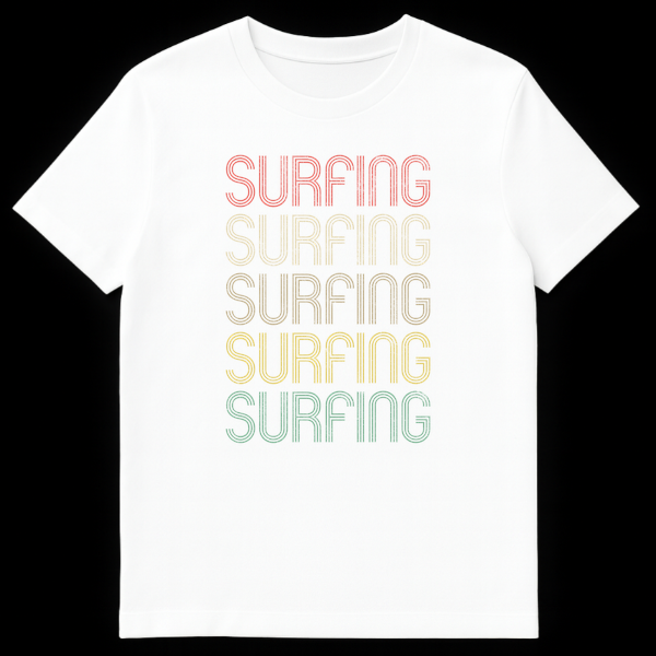 Dive into the laid-back cool of classic surf culture with this captivating Surfing t-shirt. The design prominently features the word “SURFING” stacked five times, each in a different, muted retro color, creating a stylish gradient effect. The typography boasts a distinct multi-line outline and a distressed texture, giving it an authentic vintage feel reminiscent of 70s and 80s beach life. This isn’t just a shirt; it’s a declaration of your passion for the ocean and the freedom of riding waves. With no complex puns, its charm lies purely in its aesthetic, evoking a strong sense of nostalgia and dedication to the surfing lifestyle. It’s the perfect apparel for beach trips, casual outings, or simply dreaming of the next swell. An exceptional gift for surfers, vintage style aficionados, or anyone who lives for that “endless summer” feeling and appreciates unique, retro-inspired apparel.