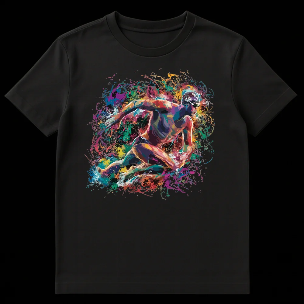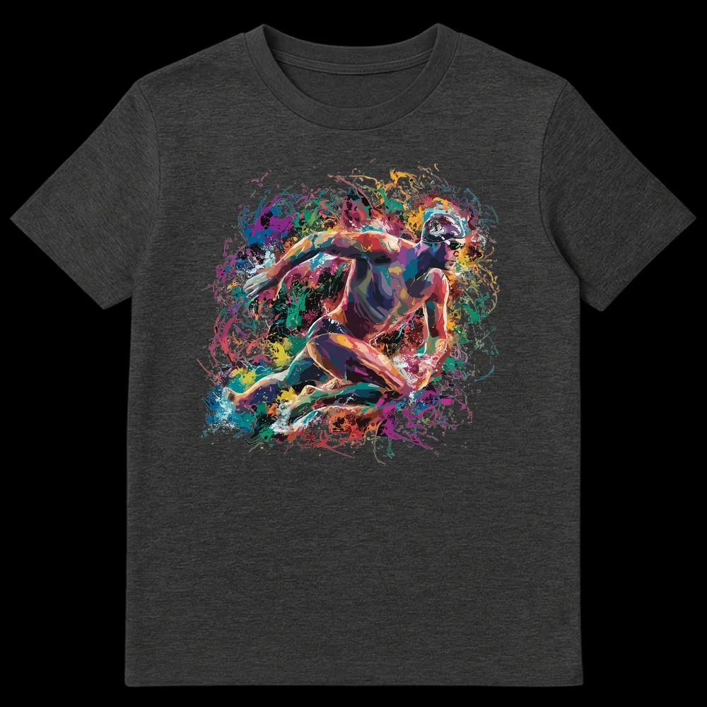 Dive into vibrant style with this dynamic swimming design. Featuring a powerful swimmer mid-stroke, surrounded by an explosive burst of abstract, colorful liquid energy, this tee celebrates the passion and fluidity of aquatic sports. Its rich, saturated palette makes it a standout piece, perfect for anyone who lives for the water or appreciates athletic artistry. An ideal gift for swimmers, coaches, or anyone inspired by the energy of the pool.