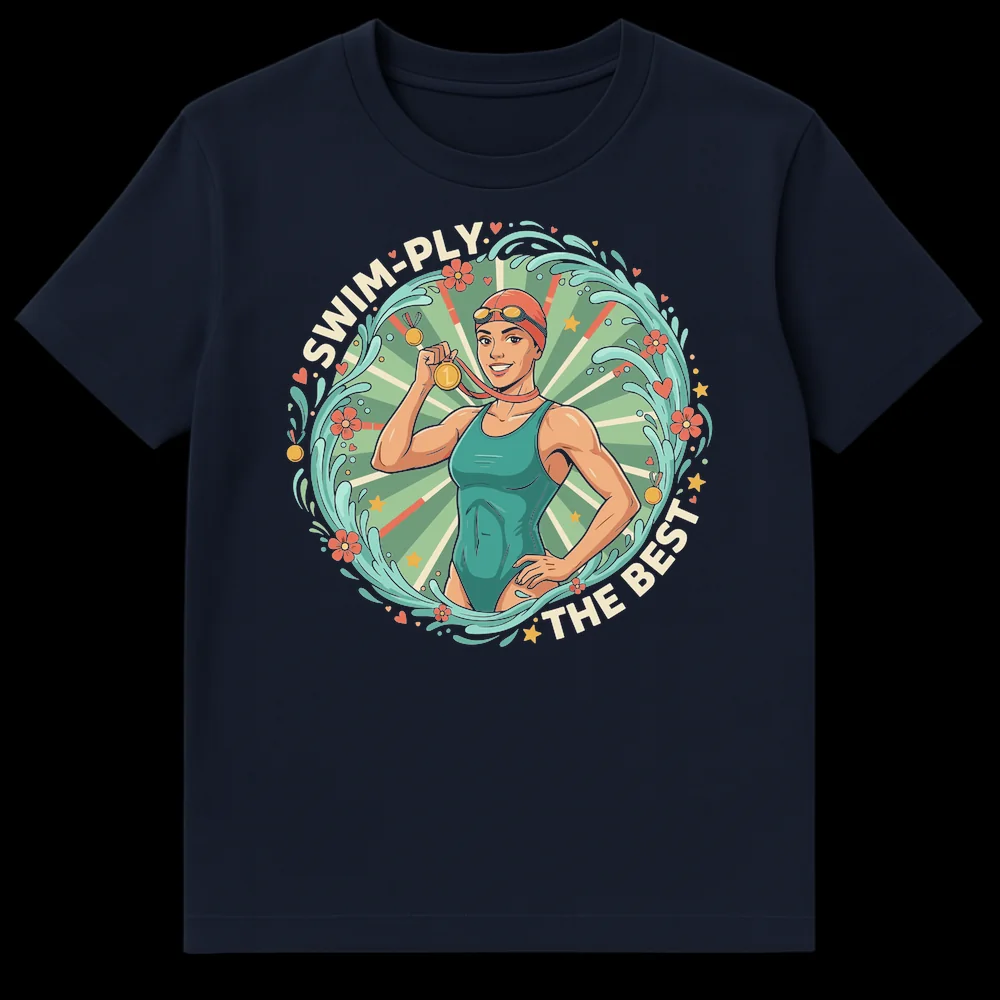 Celebrate aquatic excellence with our “SWIM-PLY THE BEST” t-shirt. This retro-inspired cartoon design features a champion female swimmer proudly displaying her gold medal, making a clever pun on “simply the best.” It’s the perfect gift for female swimmers, swim coaches, or anyone who loves the sport and a good wordplay.