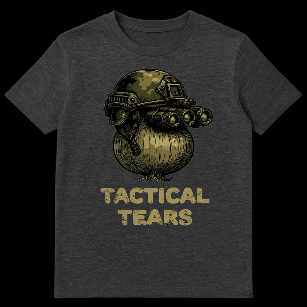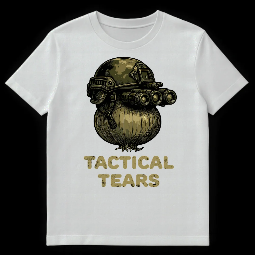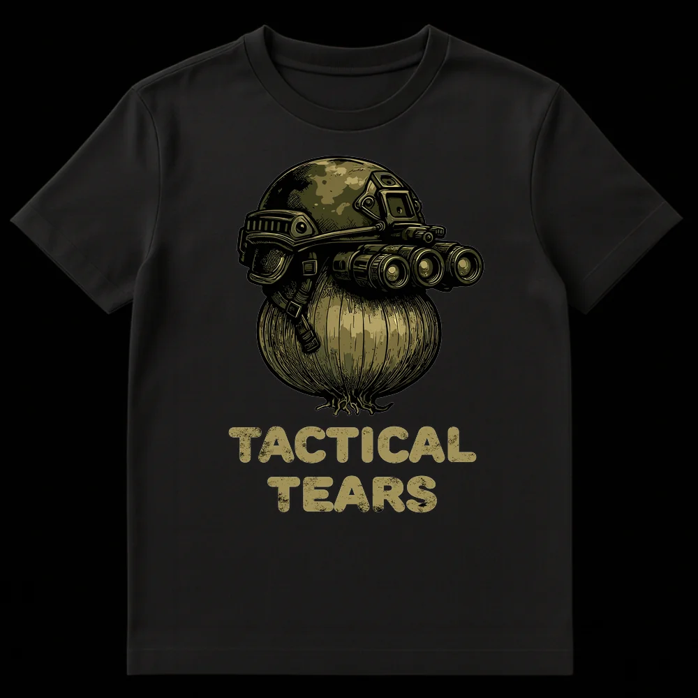 Embrace the absurdity with our “Tactical Tears” t-shirt, blending serious gear with kitchen humor. Featuring a detailed military helmet atop an onion, complete with night vision, this design is a clever visual pun on the struggles of meal prep. Perfect for tactical gear fans, chefs, or anyone who appreciates a good laugh and relatable kitchen woes. This unique tee makes an excellent gift for the witty individual in your life.