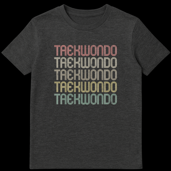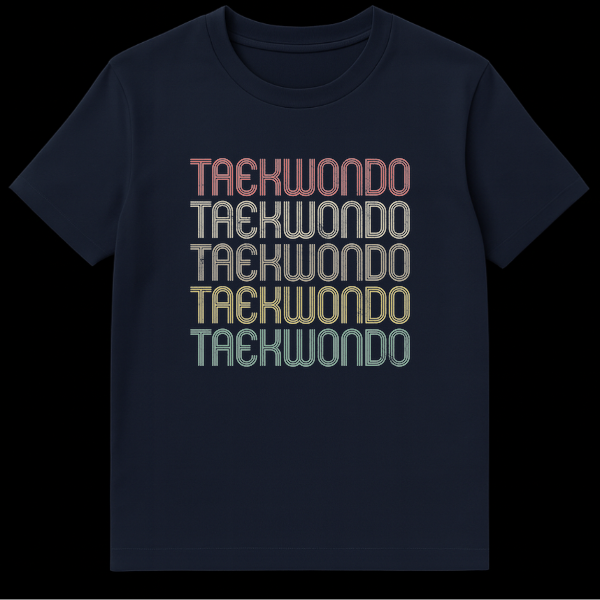 Embrace your passion for martial arts with our exclusive Retro Taekwondo T-Shirt. This design artfully repeats the word “TAEKWONDO” five times, each in a bold, multi-lined sans-serif font with a deliberate distressed, grunge overlay. The muted, earthy retro color palette (reddish-pink, beige, olive green, golden yellow, teal) against a stark black background evokes a classic 70s/80s athletic aesthetic, celebrating the heritage and enduring spirit of Taekwondo. This shirt is more than just apparel; it’s a statement of pride, dedication, and a nod to the timeless tradition of martial arts. Ideal for Taekwondo practitioners, martial arts enthusiasts, and anyone who appreciates vintage sports typography, this tee makes a thoughtful and stylish gift. Showcase your commitment with this unique, conversation-starting piece.