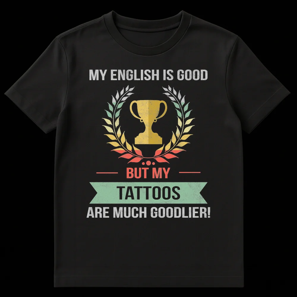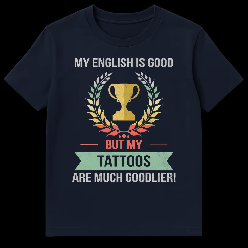 Boast your body art with this witty ‘MY ENGLISH IS GOOD BUT MY TATTOOS ARE MUCH GOODLIER!’ tee. This design cleverly uses an intentional grammatical ‘error’ to humorously declare the superiority of one’s tattoos over linguistic perfection. Featuring a distressed retro style with a laurel wreath and trophy, it’s a perfect gift for tattoo lovers with a great sense of humor and a touch of rebellious charm.