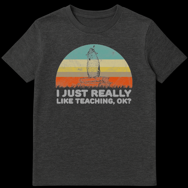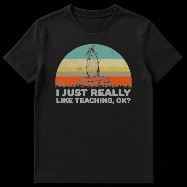 Embrace your calling with our “I JUST REALLY LIKE TEACHING, OK?” t-shirt, designed for the dedicated educator. This vintage-inspired graphic features a wise owl wearing a feathered hat and round glasses, perched atop a stack of old books, all set against a beautiful distressed semi-circle sunset background. The text, bold and white, expresses a universal truth for those in the education field—a genuine, undeniable passion for teaching. It’s a lighthearted way to show pride in your profession and a perfect conversation starter in the staff room or classroom. This top makes a fantastic appreciation gift for elementary, middle, or high school teachers, professors, or any mentor who makes a difference every day.