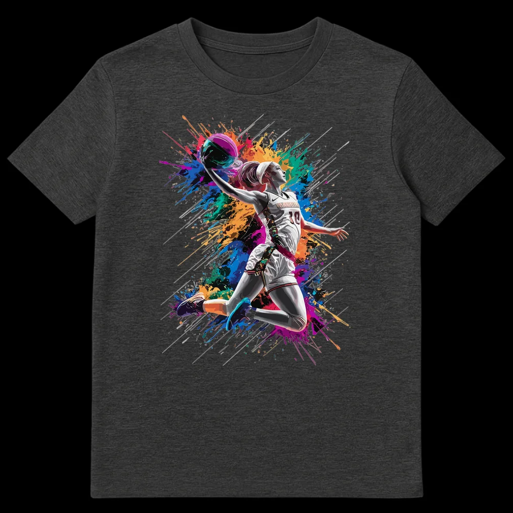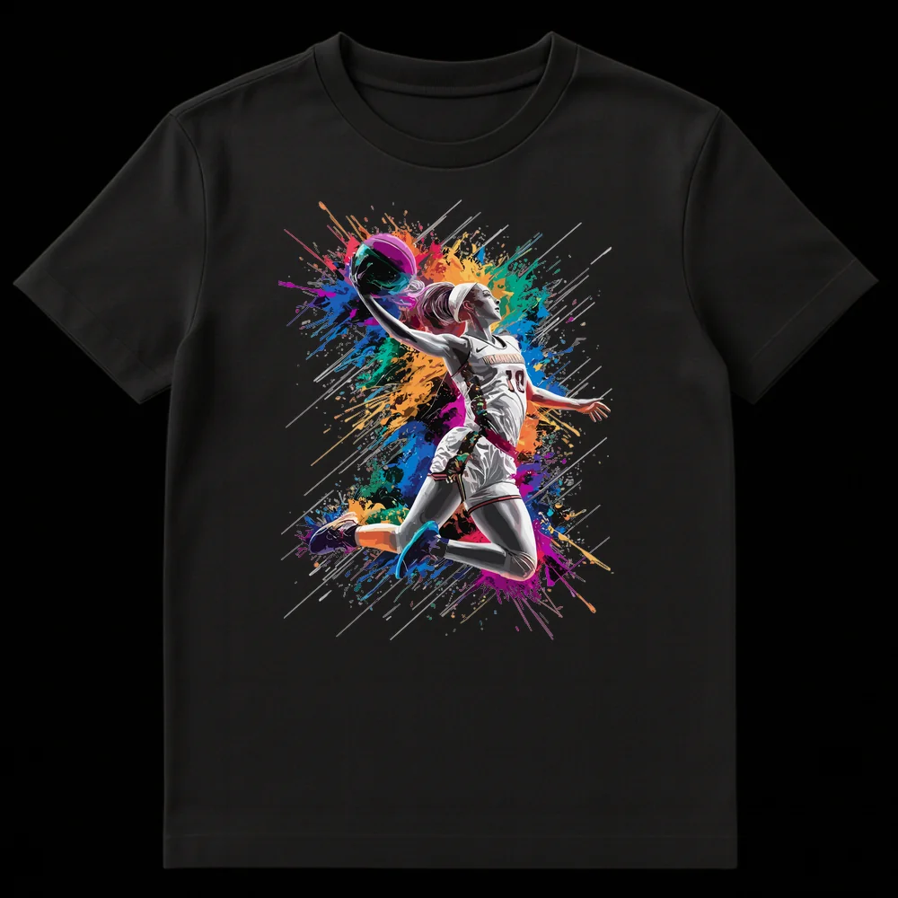 Celebrate dynamic athleticism with this vibrant t-shirt featuring a female basketball player in explosive action, donning a “TENNESSEE 10” jersey. The design captures the energy of women’s basketball with a stunning mix of realistic illustration and abstract paint splatters. Perfect for Lady Vols fans, sports enthusiasts, or anyone who appreciates powerful, artistic athletic apparel, this tee makes a fantastic gift.