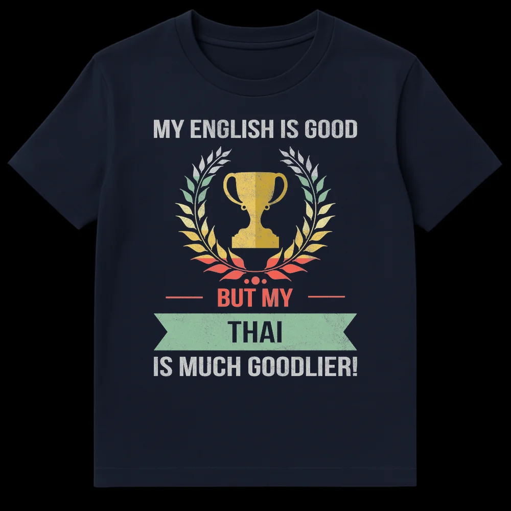 Celebrate your linguistic pride with our exclusive ‘My English is good, but my Thai is much goodlier!’ Unisex T-Shirt. This design masterfully combines witty wordplay with a classic vintage aesthetic, making it an instant favorite. The centerpiece is a stylishly distressed graphic of a trophy and laurel wreath, symbolic of achievement, which humorously elevates the grammatically ‘incorrect’ superlative ‘goodlier’ for dramatic effect. It’s a playful nod to your exceptional Thai language skills or your profound affection for Thai culture. Whether you’re an expatriate, a dedicated language learner, a traveler who fell in love with Thailand, or simply someone who appreciates a smart, self-aware joke, this shirt speaks volumes. It’s a fantastic gift for Thai language enthusiasts, friends of Thailand, or anyone who enjoys a good cultural pun and a touch of retro charm. Embrace the humor and express your unique identity.