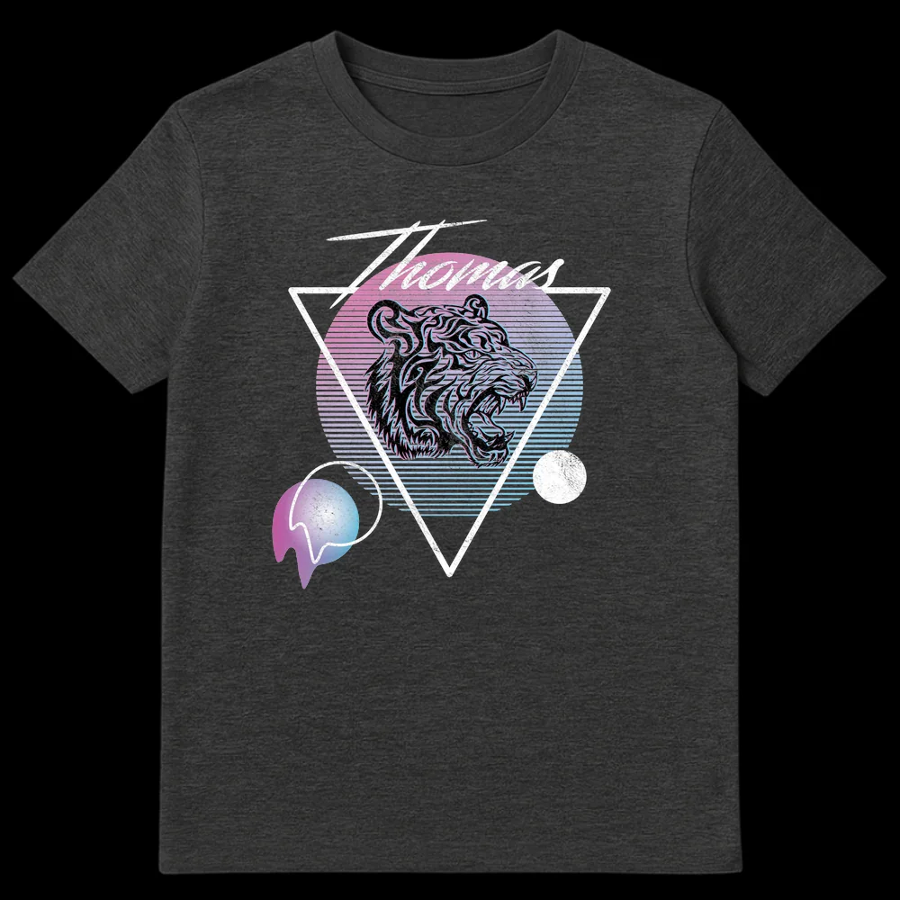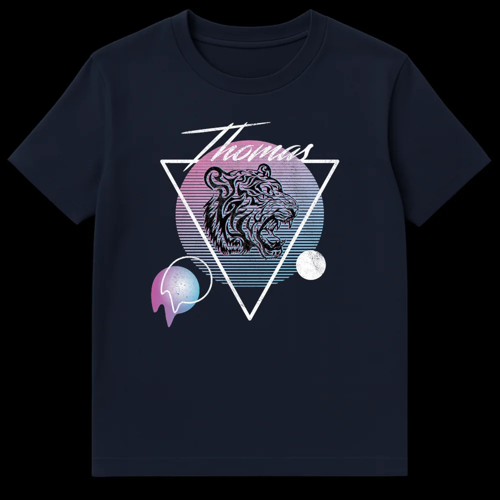 Embrace 80s nostalgia with the Thomas Synthwave Tiger t-shirt. This design features a roaring tiger head, dynamic neon pink and blue gradients, and a distressed retro aesthetic, all personalized with the name “Thomas.” Perfect for fans of synthwave culture and vintage cyberpunk vibes, this tee makes an ideal gift for any Thomas who loves unique, edgy style.