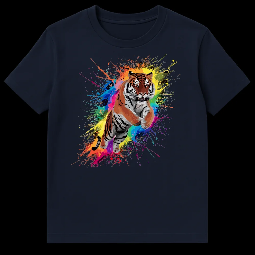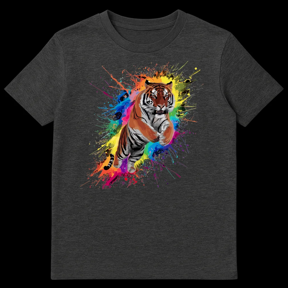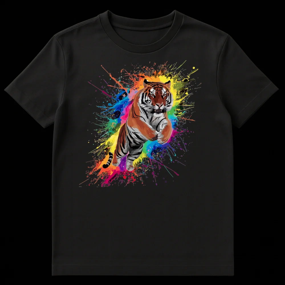 Embrace the wild and vibrant with our exclusive Tiger Enthusiast T-shirt, a stunning piece that brings together the raw power of nature and an explosion of artistic color. This striking design showcases a majestic tiger, rendered with graphic precision, captured mid-leap surrounded by an energetic swirl of rainbow paint splatters. The high-contrast palette, featuring the tiger’s natural hues against a backdrop of vivid reds, blues, yellows, and purples, makes a bold statement without needing any text. It’s more than just a shirt; it’s a symbol of strength, courage, and the uninhibited expression of one’s true colors. Perfect for those who feel a connection to powerful animals, appreciate dynamic illustrative art, or simply love to stand out. Gift this unique tee to tiger lovers, art aficionados, or anyone who embodies a passionate and adventurous spirit, celebrating their individuality and vibrant energy. It’s designed to inspire awe and convey a sense of dynamism wherever you go.