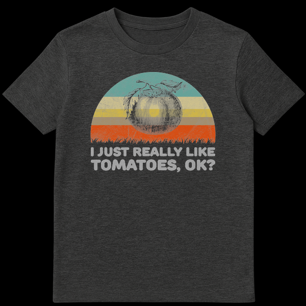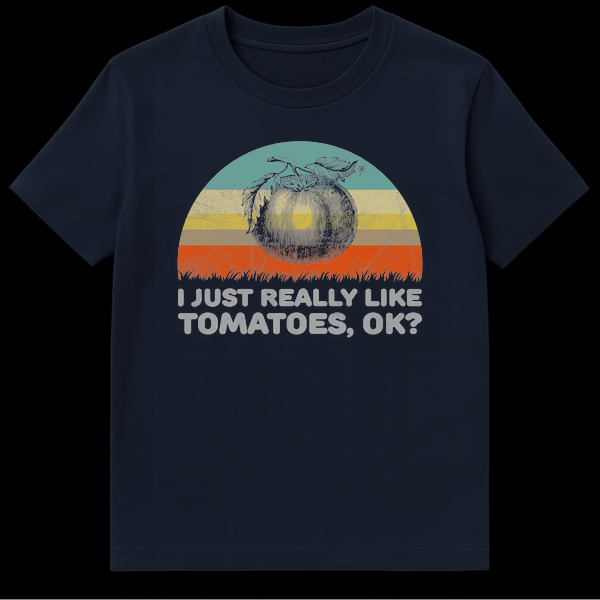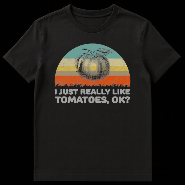 Declare your specific passion with our “I JUST REALLY LIKE TOMATOES, OK?” t-shirt. This design features a vintage botanical tomato illustration against a retro sunset, combining a classic aesthetic with a relatable, deadpan statement. It’s perfect for anyone with an unshakeable fondness for tomatoes, making it an ideal gift for gardeners, home cooks, or food enthusiasts who appreciate quirky humor.