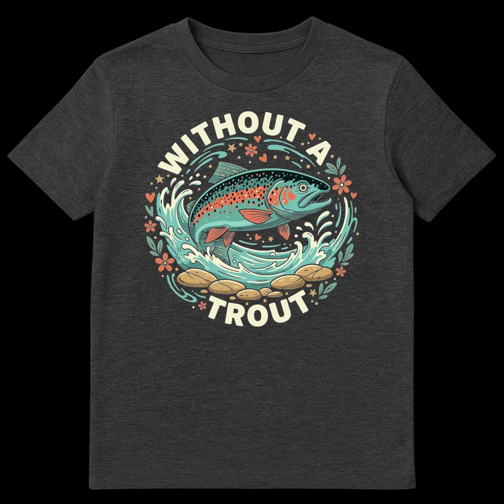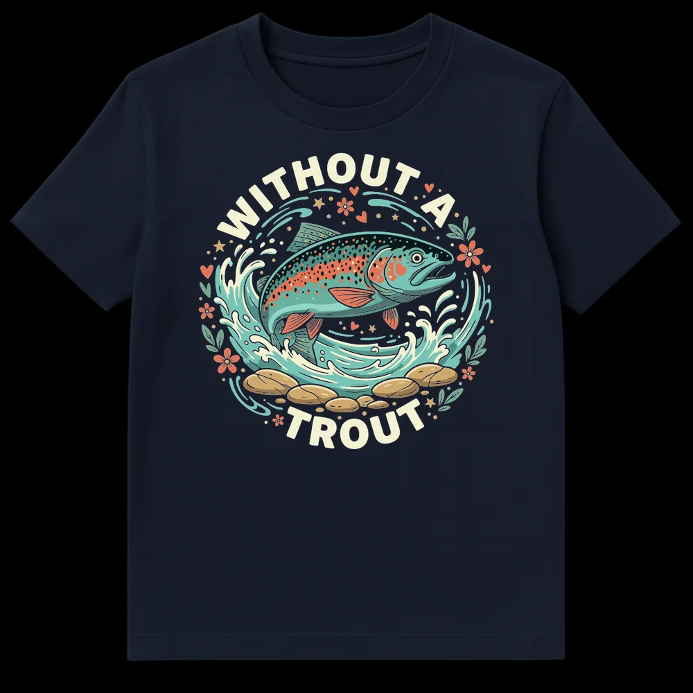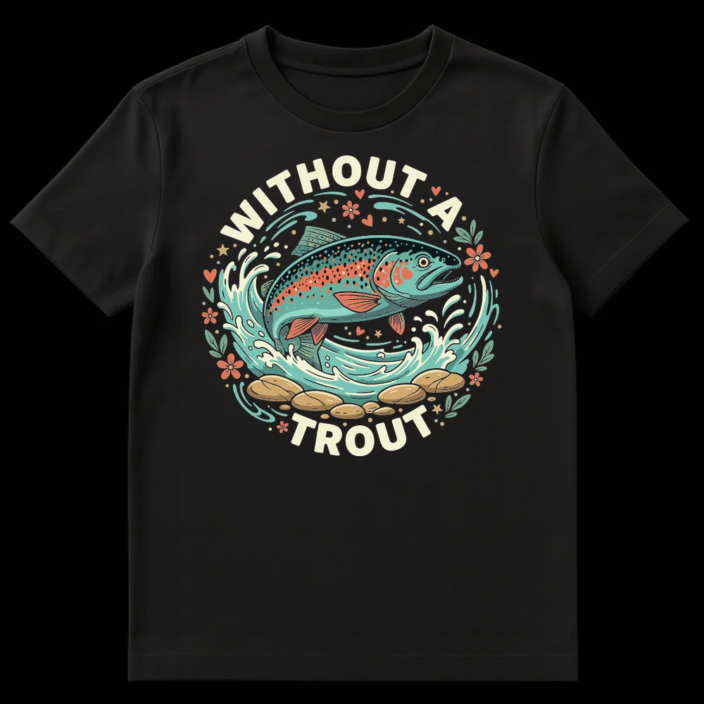 Reel in some laughs with this “WITHOUT A TROUT” t-shirt, a clever fishing pun for any angler! Featuring a vibrant rainbow trout leaping from the water, this design playfully expresses an undeniable passion for fishing. It’s the perfect catch for anyone who loves the outdoors or enjoys a good dad joke, making it an excellent gift for fishing enthusiasts.
