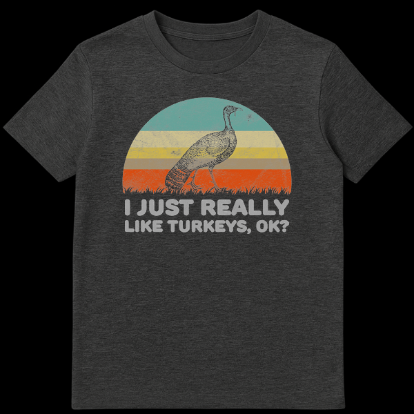 Declare your genuine affection with our “I JUST REALLY LIKE TURKEYS, OK?” t-shirt. This design, featuring a detailed vintage-style turkey against a segmented sunset, playfully expresses an earnest love for the bird beyond holiday meals. It’s a perfect gift for birdwatchers, nature enthusiasts, or anyone with a quirky appreciation for wildlife.