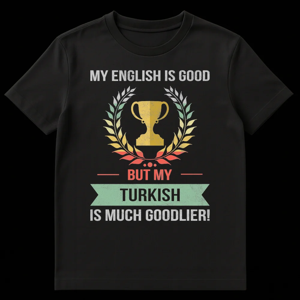 Celebrate your linguistic pride with this humorous Turkish language t-shirt. Featuring the witty phrase “MY ENGLISH IS GOOD BUT MY TURKISH IS MUCH GOODLIER!” alongside a vintage-style trophy and laurel, it’s a playful nod to fluency. This unique design makes a perfect gift for Turkish speakers, language learners, or anyone who appreciates clever wordplay and cultural humor.