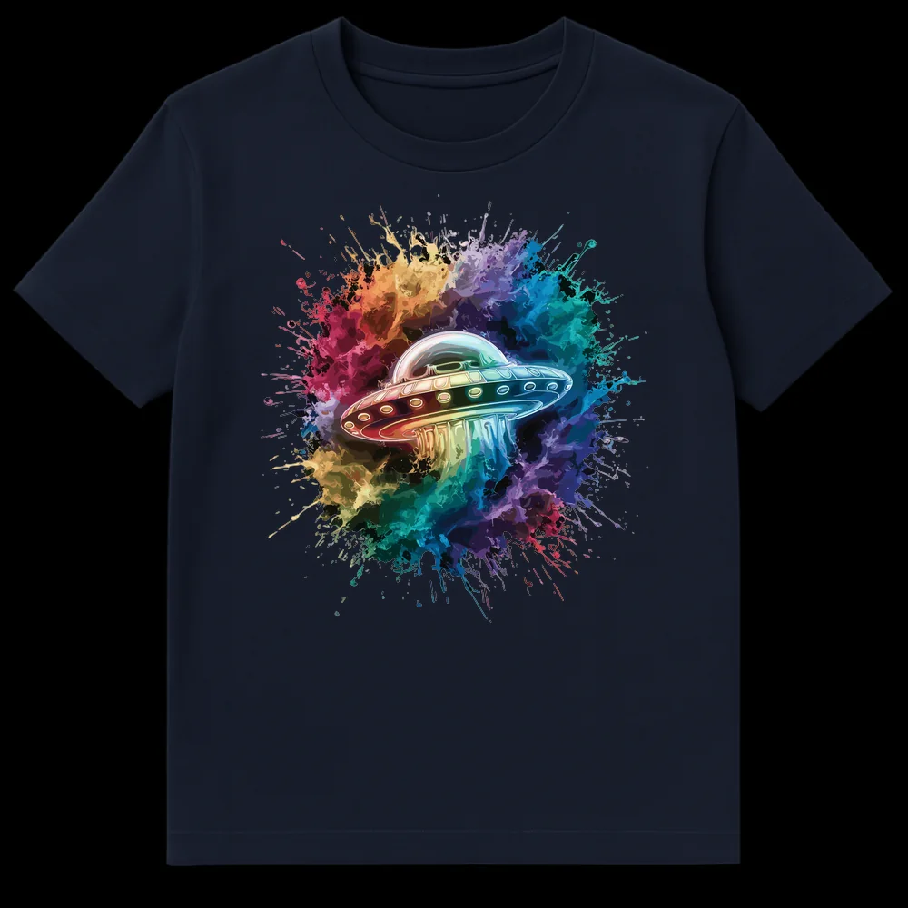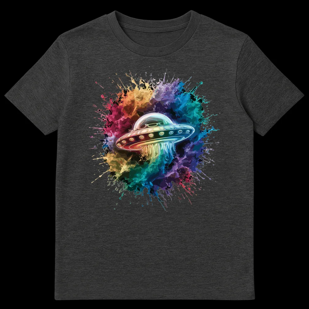 Dive into the unknown with our eye-catching t-shirt, featuring a retro-futuristic UFO hovering amidst a spectacular burst of rainbow paint splatters. This design is a vibrant celebration of science fiction wonder, blending classic alien imagery with dynamic, colorful art. Perfect for any sci-fi fan or art lover looking for a statement piece, it makes an excellent gift for enthusiasts of space, aliens, and unique graphic tees.