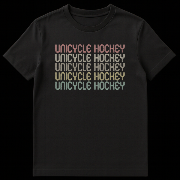 Embrace the thrill of the extraordinary with our “Unicycle Hockey” Vintage Sport T-Shirt. This design proudly displays the phrase “UNICYCLE HOCKEY” repeated five times, creating a bold, stack-effect statement in a distinctive retro-inspired typography. The characters feature parallel lines and a subtly distressed texture, giving it an authentic worn-in feel reminiscent of classic 70s and 80s sports gear. Set against a solid black background, the text transitions through a captivating muted color gradient of red, gold, yellow, and teal, adding to its nostalgic charm. More than just a shirt, it’s a badge of honor for Unicycle Hockey players, enthusiasts, and anyone captivated by unique athletic challenges. Spark conversations and showcase your unconventional interests. This tee makes an exceptional gift for unicyclists, hockey fans, or anyone who appreciates the blend of vintage style and niche sports culture.