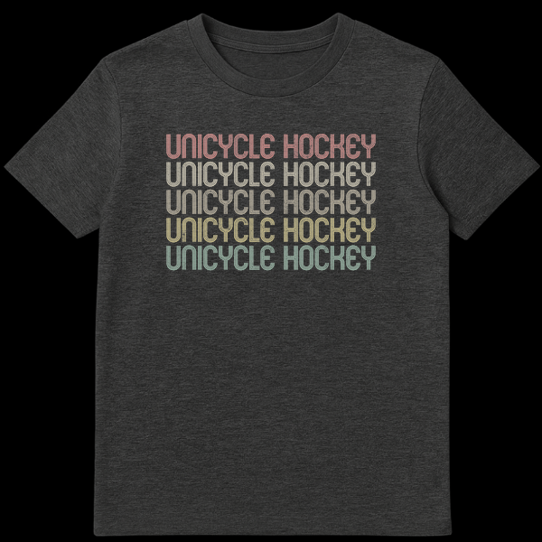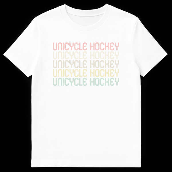 Display your passion for the unique sport of Unicycle Hockey with this standout tee. Featuring a vertically stacked “UNICYCLE HOCKEY” design in a cool retro font with a subtle color gradient and distressed finish, this shirt is a perfect identifier for players and fans. It’s an ideal gift for anyone who loves niche sports or appreciates a vintage athletic aesthetic.