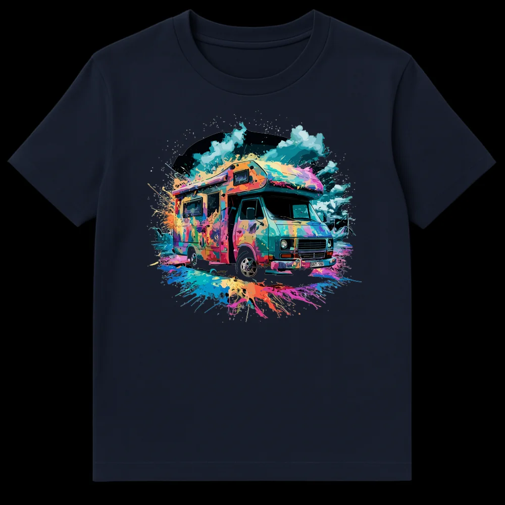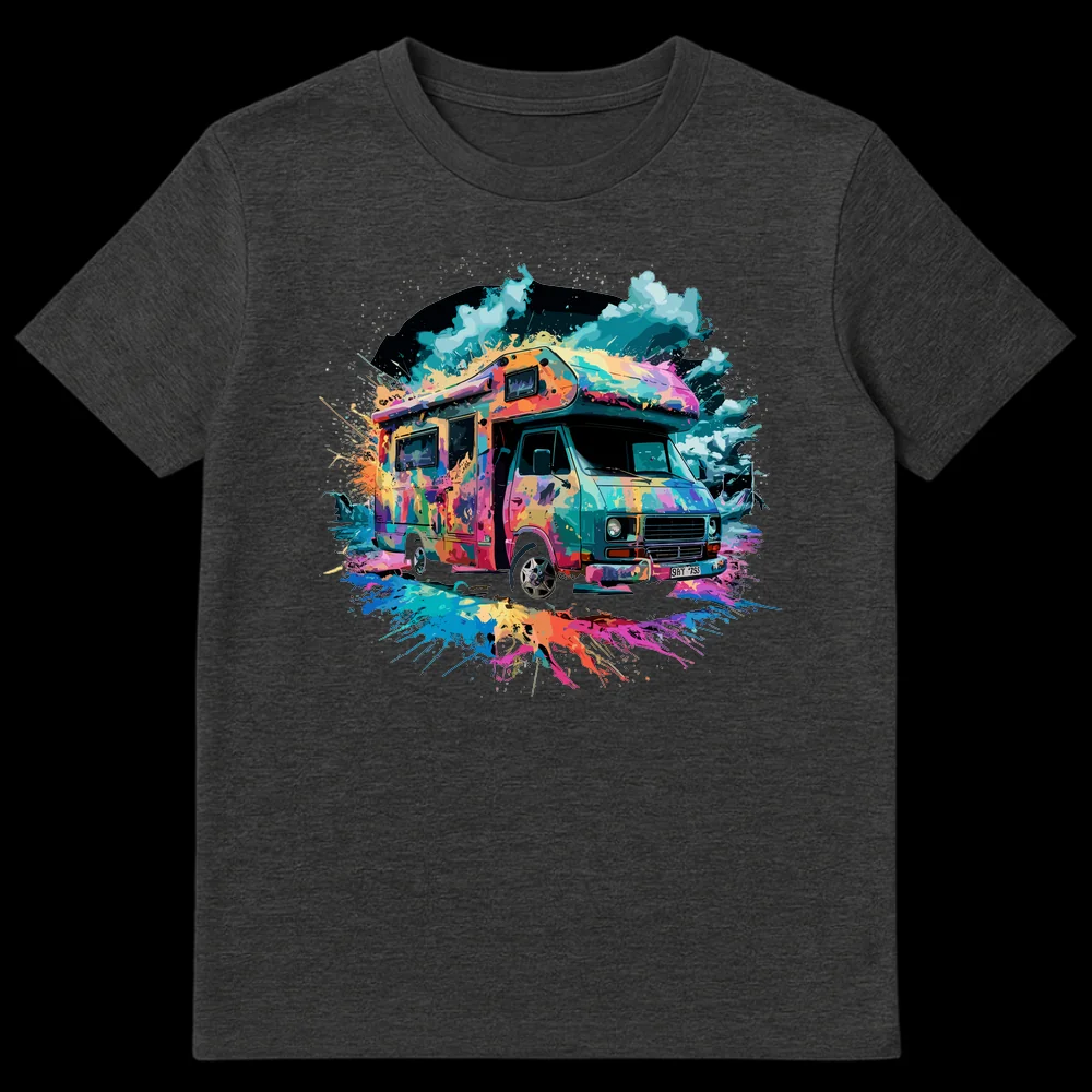 Hit the road in style with our eye-catching t-shirt, designed for the ultimate adventurer. This unique design showcases a classic camper van, reimagined through a explosion of highly saturated, multi-chromatic paint splatters reminiscent of street art or digital watercolor. It’s a visual celebration of wanderlust, evoking the bohemian vibes of music festivals and the endless possibilities of life on the open road. The energetic teal, magenta, orange, and blue hues pop intensely against the black background, ensuring you stand out. This tee isn’t just clothing; it’s a statement about freedom, creativity, and the pursuit of unforgettable journeys. A fantastic gift for anyone passionate about van life, camping, vintage vehicles, or simply living life in full color.