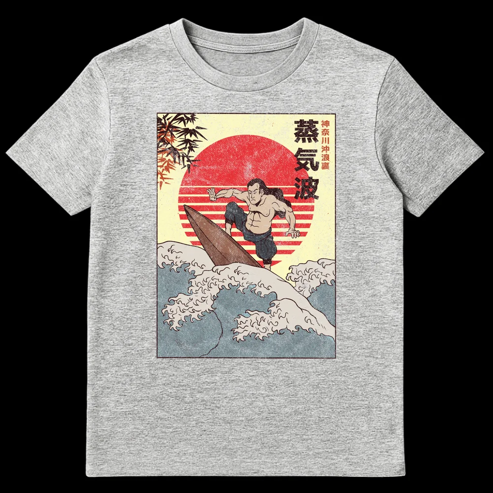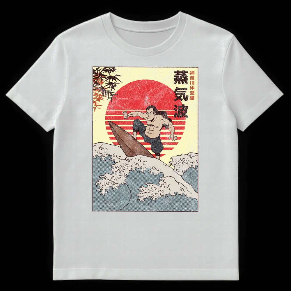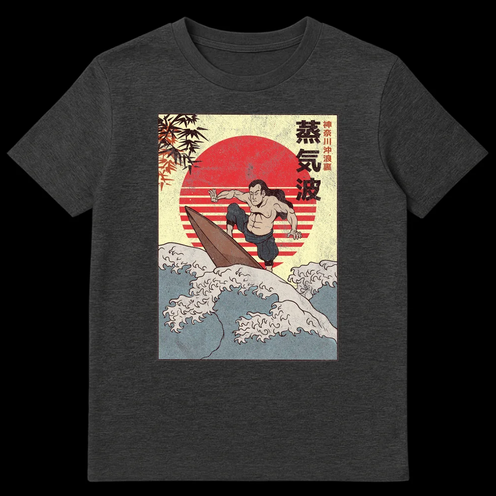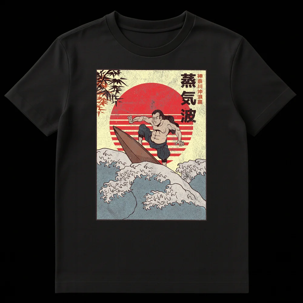 Embrace the ultimate cultural mashup with our ‘Vaporwave Great Wave Surfer’ t-shirt. This unique design brilliantly reimagines Hokusai’s legendary ‘The Great Wave off Kanagawa’ with a modern, anachronistic surfer catching the epic swell. The shirt features the original Japanese title of Hokusai’s masterpiece alongside ‘蒸気波’ (Jōkiha), which translates to ‘Vaporwave’ – creating a brilliant visual and textual pun. Perfect for internet culture aficionados, Japanese art lovers, and anyone with a taste for niche humor and aesthetic apparel. Its distressed, vintage look makes it a conversation starter, ideal for expressing individuality and a knowing appreciation for both classical art and modern digital aesthetics. A standout gift for Vaporwave fans, art students, or anyone who loves unique graphic tees that tell a story.