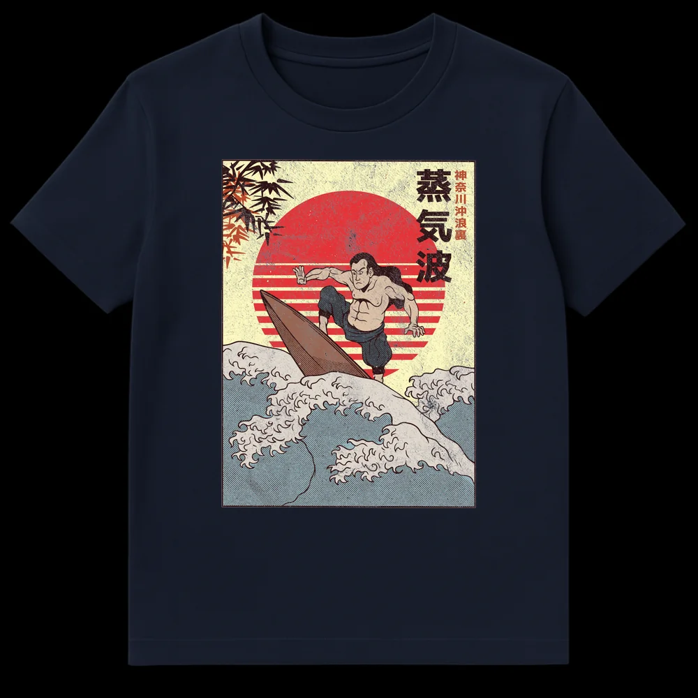 Embrace the ultimate cultural mashup with this unique tee featuring a muscular surfer conquering Hokusai’s iconic Great Wave. The Japanese text “蒸気波” explicitly states “Vaporwave,” perfectly blending ancient art with modern internet aesthetics. This clever, distressed design makes an ideal gift for Vaporwave fans, Japanese art enthusiasts, or anyone appreciating retro-futuristic style.