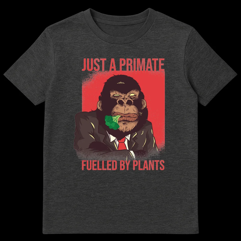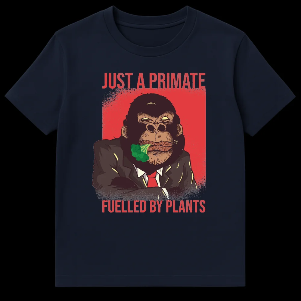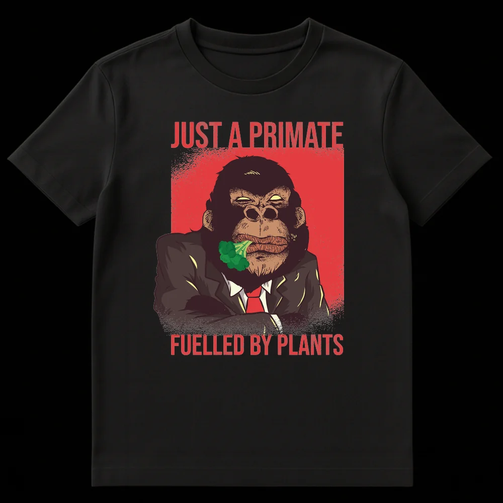 Embrace your plant-based strength with this bold t-shirt featuring an anthropomorphic gorilla in a suit, fiercely munching on broccoli. The text “JUST A PRIMATE FUELLED BY PLANTS” cleverly subverts stereotypes, highlighting the raw power and natural diet of herbivores. It’s a perfect gift for vegans, vegetarians, or anyone who appreciates a strong, humorous statement about their plant-powered lifestyle.
