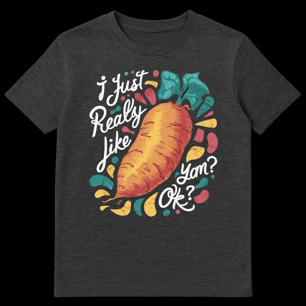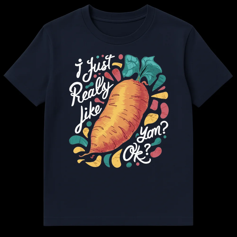Embrace your love for root vegetables with this quirky “I Just Really Like Yam? Ok?” t-shirt. Featuring a beautifully textured, hand-drawn yam illustration, this design playfully highlights the common sweet potato vs. yam naming convention. It’s a humorous nod to foodies and anyone who appreciates a wholesome, self-aware culinary joke, making it an excellent gift for home cooks, vegetarians, or pun lovers.