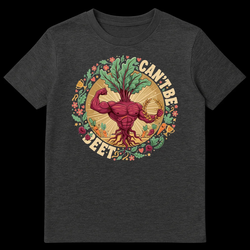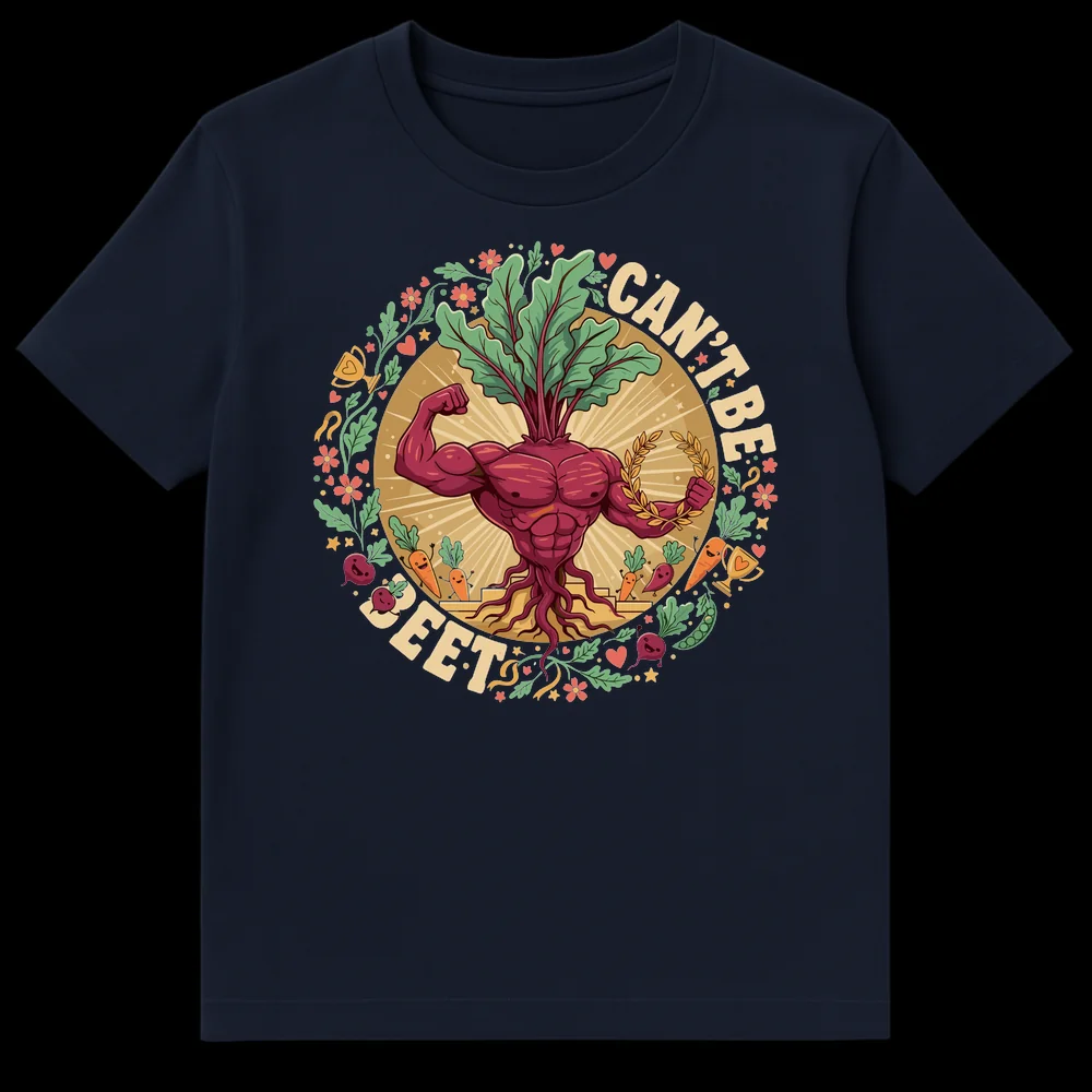 Unleash your inner champion with our ‘CAN’T BE BEET’ t-shirt, a witty and vibrant tribute to strength and healthy living. This eye-catching design features a powerfully muscled beet flexing its bicep, surrounded by happy vegetables and trophies, all against a radiant sunburst. The phrase ‘CAN’T BE BEET’ ingeniously puns on ‘can’t be beat,’ making it an instant conversation starter and a humorous declaration of invincibility. It’s the perfect way for fitness enthusiasts, plant-based diet advocates, gardeners, or anyone with a love for wholesome food and clever wordplay to express their unique style. Gift this tee to the health-conscious humorist in your life, inspiring smiles and a celebration of nutritional power and resilience.