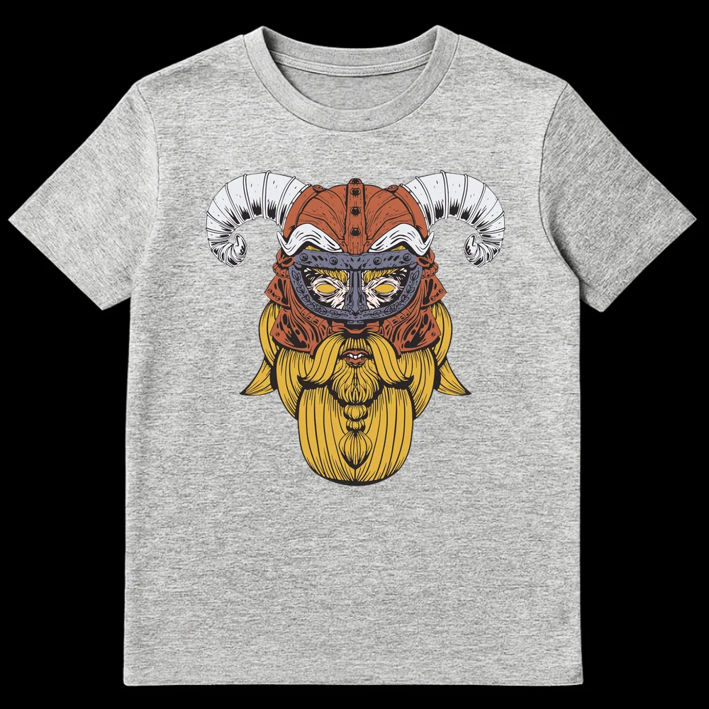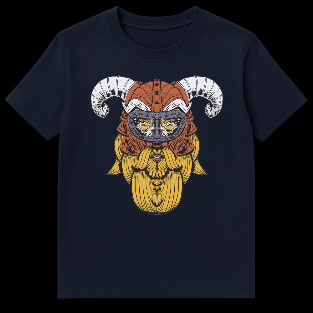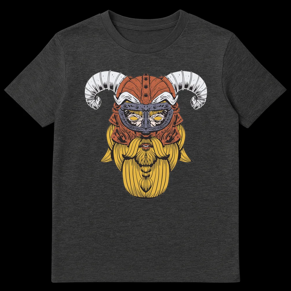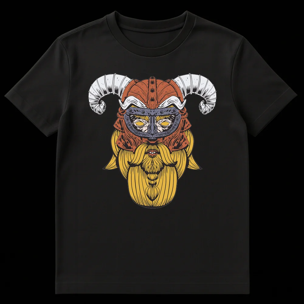 Unleash your inner warrior with this striking Viking t-shirt, featuring a detailed, tattoo-style depiction of a fierce horned warrior. The intricate line art captures the essence of Norse mythology, with a golden beard, powerful gaze, and an iconic helmet. This unique design makes a bold statement and is the perfect gift for fans of Viking lore, fantasy, and ancient warrior cultures.