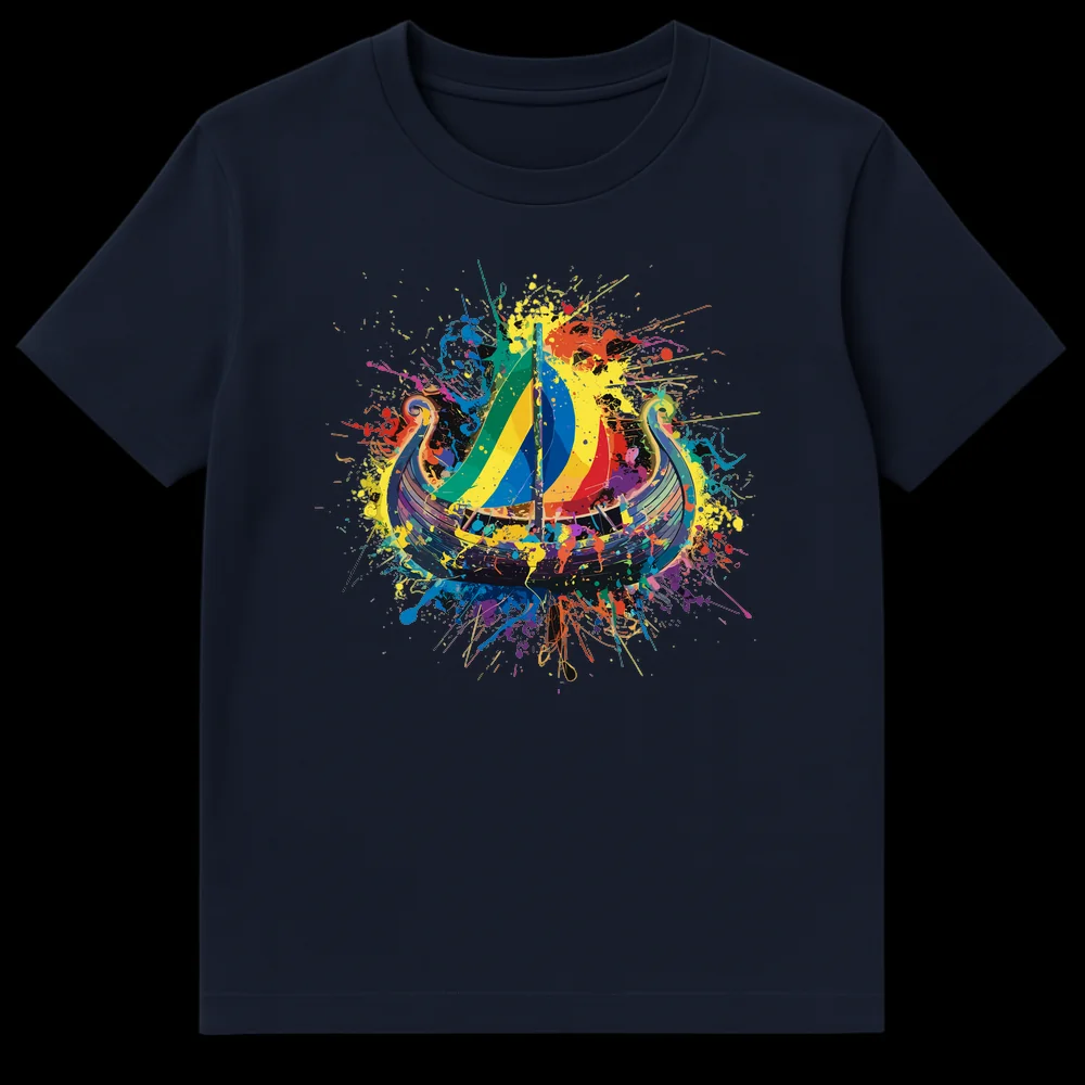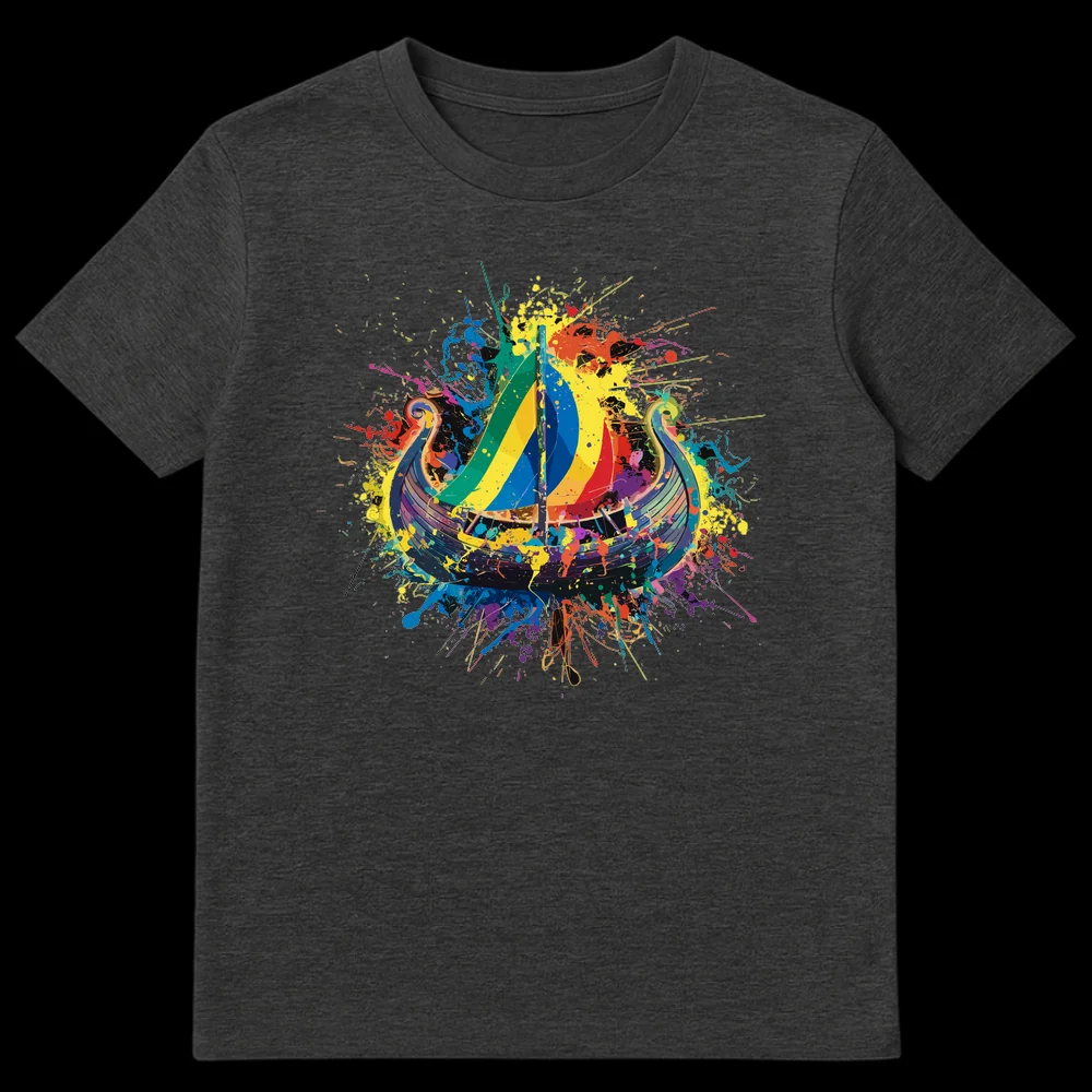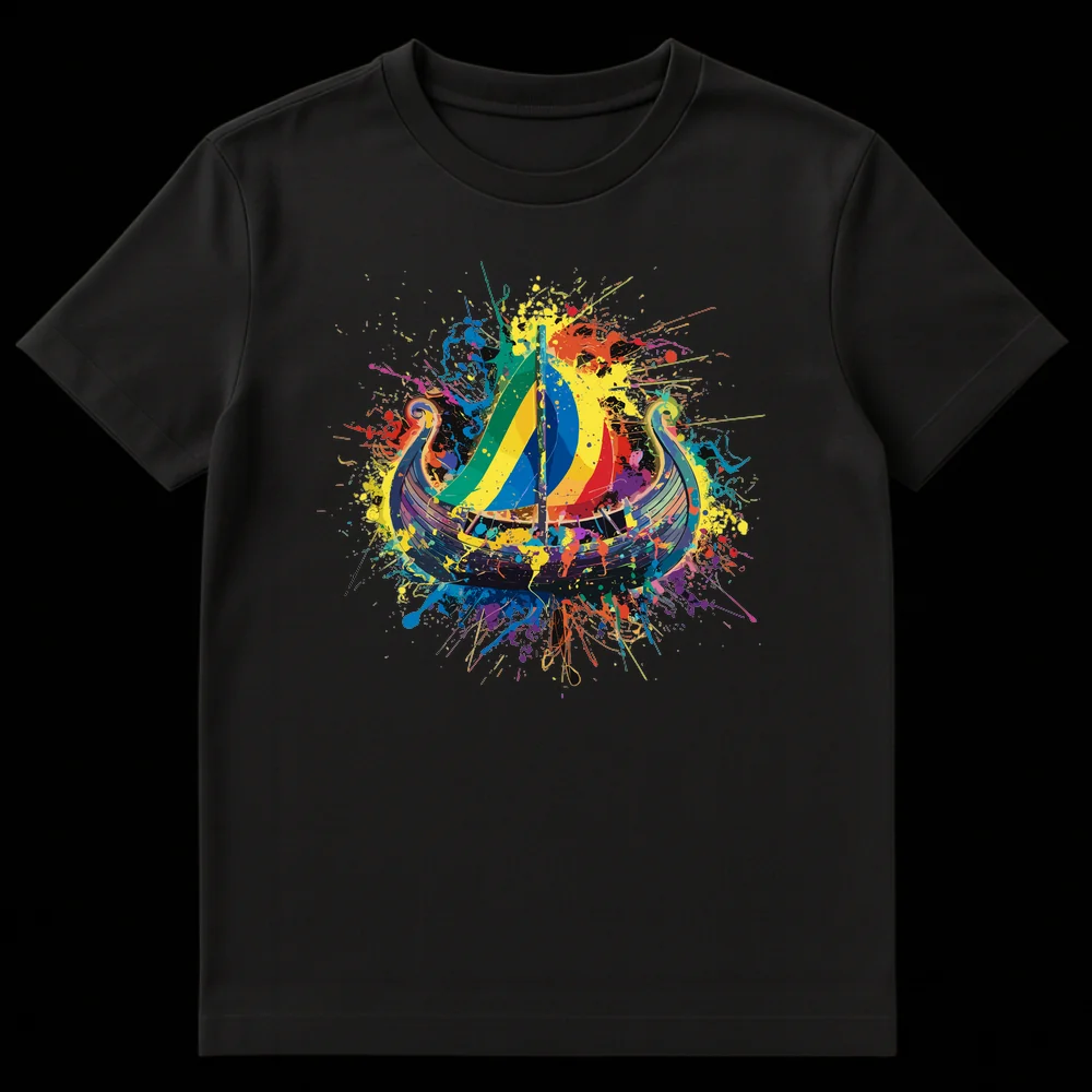 Unleash your adventurous spirit with this vibrant Viking longship design. Featuring a powerful longship sailing through a dynamic explosion of rainbow paint splatters, this shirt merges ancient Norse strength with modern artistic flair. It’s a striking and colorful piece, perfect for anyone who loves Norse mythology, art, and bold, unique apparel.