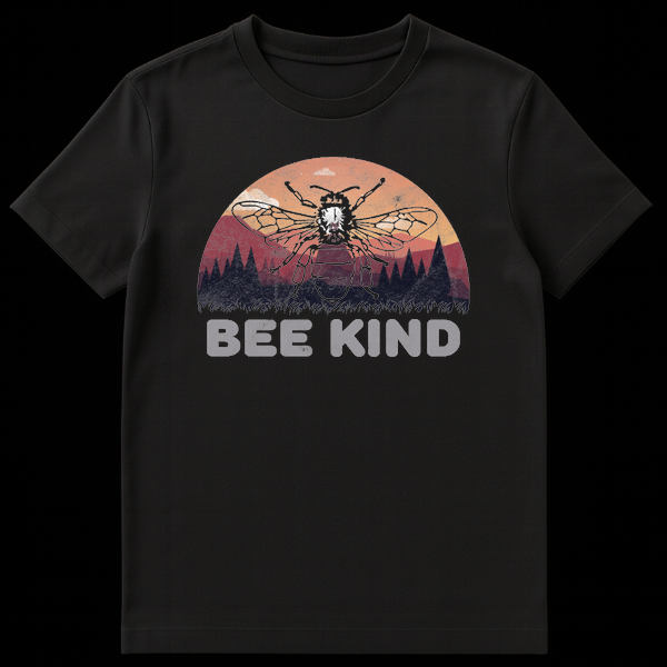 Embrace a message of compassion and nature with our Vintage Bee Kind T-Shirt. This eye-catching design blends retro aesthetics with a meaningful message, featuring a large, detailed sketch of a honeybee hovering over a beautiful semi-circular landscape. The background showcases a dusty orange sunset, layered purple mountains, and a silhouette of pine trees, all rendered in a trendy distressed style that gives it a classic, worn-in look. The bold text “BEE KIND” sits beneath the graphic, offering a charming pun that reminds us all to be gentle with one another and our planet. Whether you are an avid gardener, a beekeeper, an environmentalist, or simply someone who appreciates vintage outdoor vibes, this shirt is a must-have addition to your wardrobe. It also makes a thoughtful and stylish gift for friends and family who want to spread good vibes.