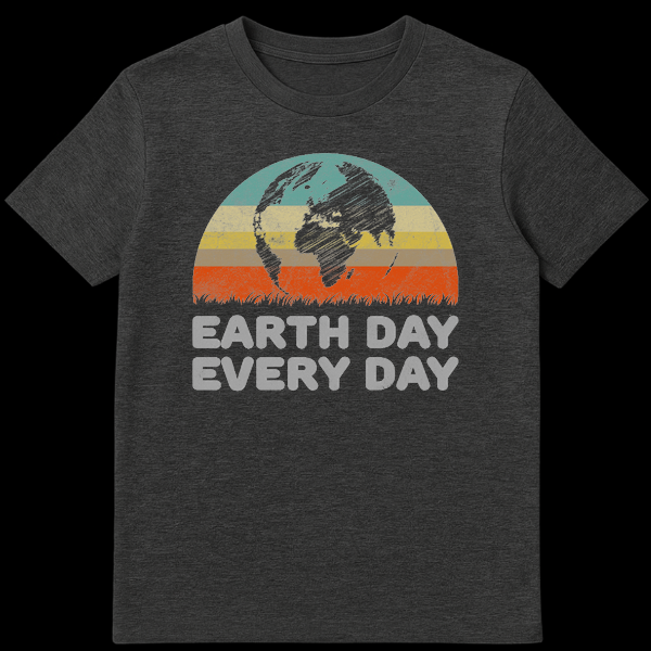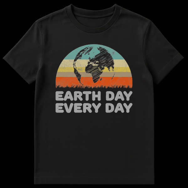 Show your commitment to the planet with this unique ‘Earth Day Every Day’ t-shirt. The design features a striking distressed Earth silhouette, detailed with a scratchy, cross-hatch effect, set against a semi-circular backdrop of muted retro stripes in teal, pale yellow, olive green, and terra cotta. This vintage aesthetic, complete with a distressed green grass horizon, creates a powerful visual statement. The text, ‘EARTH DAY EVERY DAY,’ rendered in a blocky, distressed light grey font, reinforces the crucial message that environmental care isn’t just for one day, but a continuous effort. It’s an ideal gift for environmentalists, nature enthusiasts, or anyone who loves unique, vintage-inspired apparel with a meaningful cause.