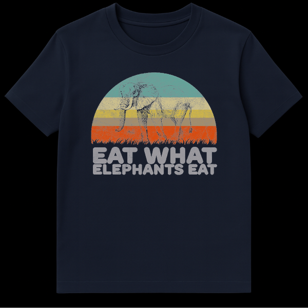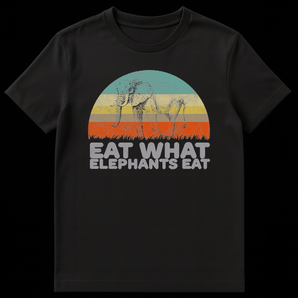 Make a statement with our ‘Eat What Elephants Eat’ graphic t-shirt, a stylish nod to plant-based living! This eye-catching design showcases a beautifully illustrated elephant in a vintage, line-art style, set against a distressed semi-circular background with muted, retro-colored stripes reminiscent of a classic sunset. The bold, grunge-textured text playfully encourages a healthy, herbivorous diet, making it a conversation starter. Perfect for vegans, vegetarians, animal lovers, or anyone with a sense of humor about their food choices, this tee blends a powerful message with a popular aesthetic. The solid black background ensures the vibrant, weathered illustration and text pop, making it an ideal gift for friends and family who appreciate unique, meaningful fashion.