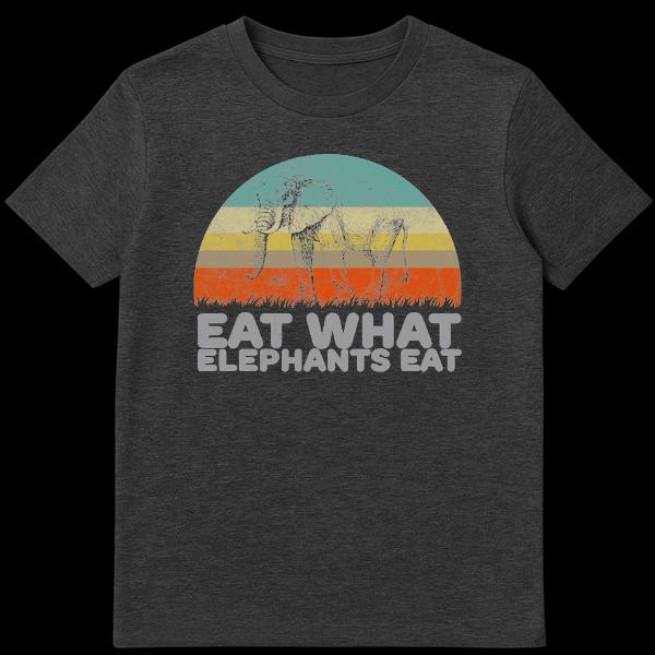 Embrace a plant-based lifestyle with this unique ‘Eat What Elephants Eat’ t-shirt. Featuring a distressed vintage elephant against a retro sunset, this design playfully promotes healthy eating. Its cool, weathered aesthetic makes it a perfect gift for vegans, vegetarians, or anyone who loves elephants and a retro vibe.
