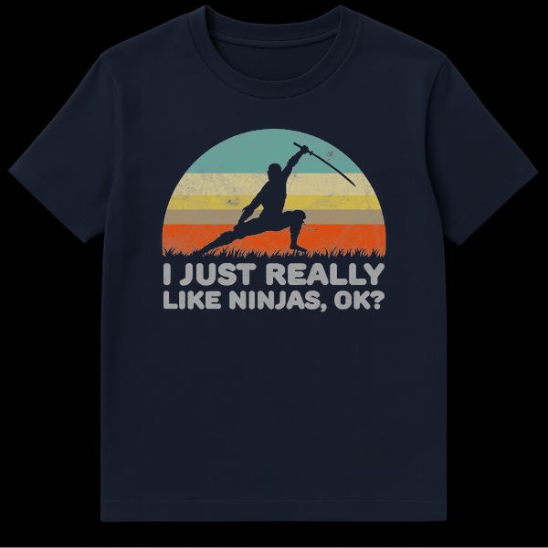 Embrace your inner warrior with this vintage-inspired ninja graphic tee. Featuring a classic distressed retro sunset and a cool ninja silhouette, this shirt humorously declares, “I Just Really Like Ninjas, OK?” It makes the perfect sarcastic gift for martial arts enthusiasts, anime fans, or anyone who never grew out of their ninja phase.