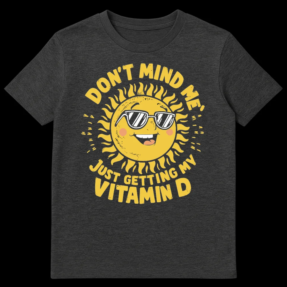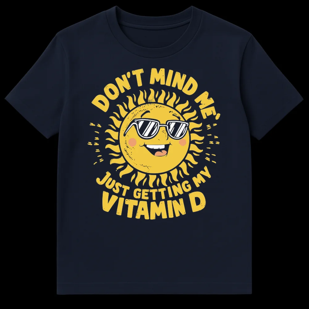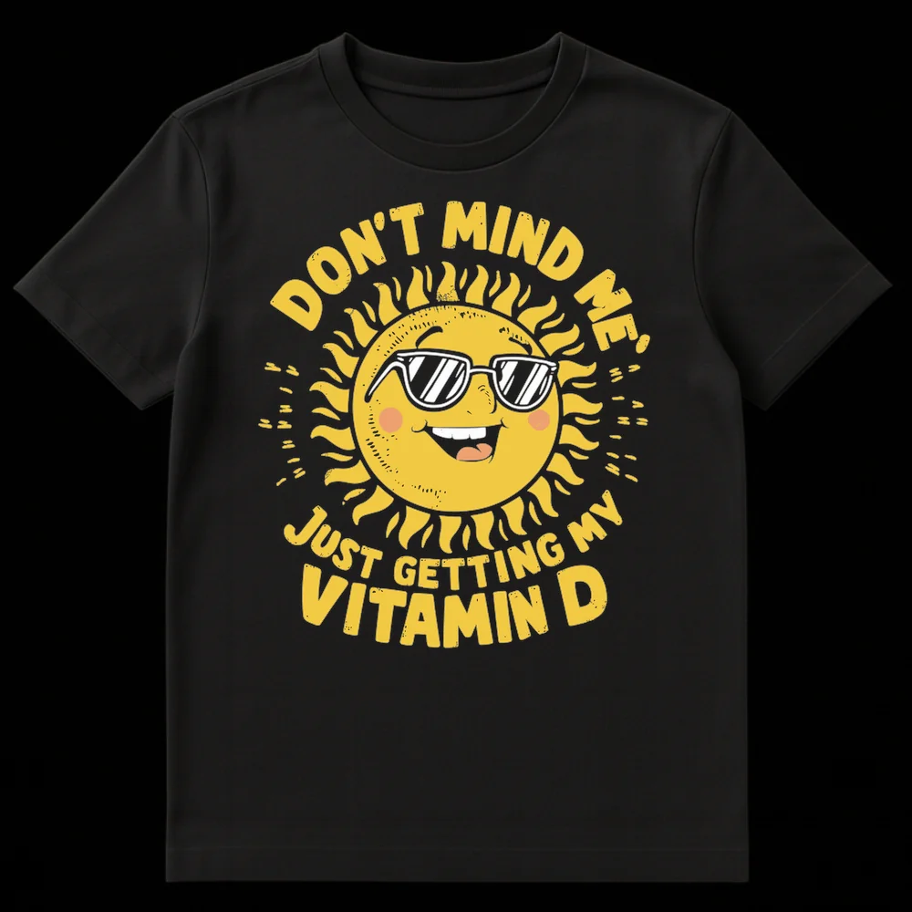 Catch some rays and a laugh with our “DON’T MIND ME, JUST GETTING MY VITAMIN D” t-shirt. This design features a cool, sunglasses-wearing sun, making a hilarious self-aware commentary on sunbathing. It’s the perfect gift for anyone who loves summer, sunshine, and a good pun, ideal for beach trips or everyday wear.