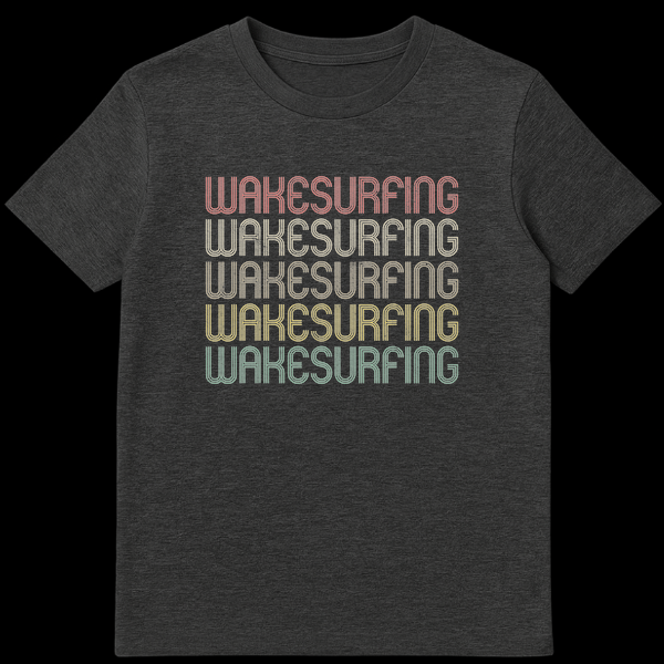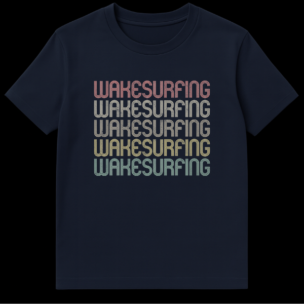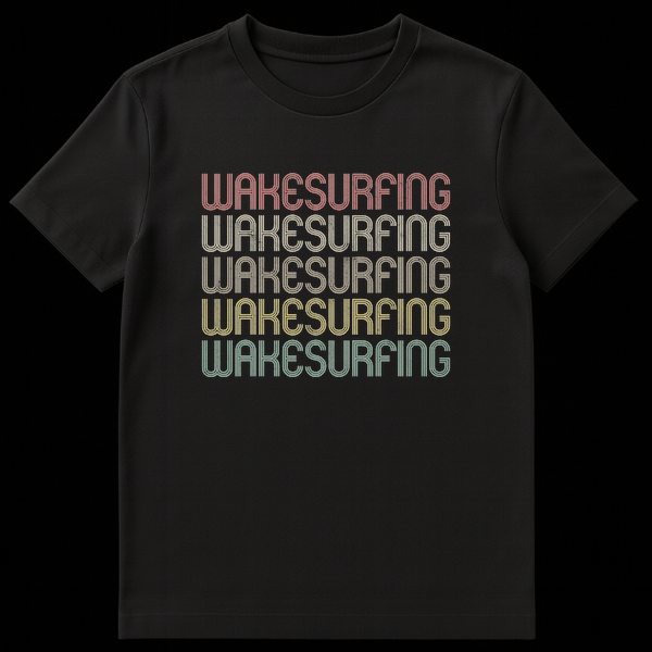 Embrace the Wakesurfing lifestyle with this iconic t-shirt featuring “WAKESURFING” repeated five times in a stacked, retro-inspired typography. The muted gradient colors and distressed texture give it an authentic vintage appeal, perfect for anyone who lives for the water. This design is a direct and stylish declaration of your passion for the sport, making it an ideal gift for wakesurfing enthusiasts, instructors, or lake life lovers.