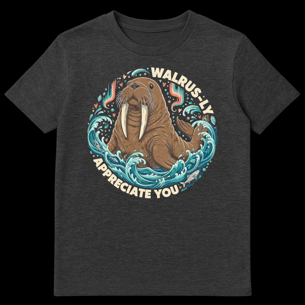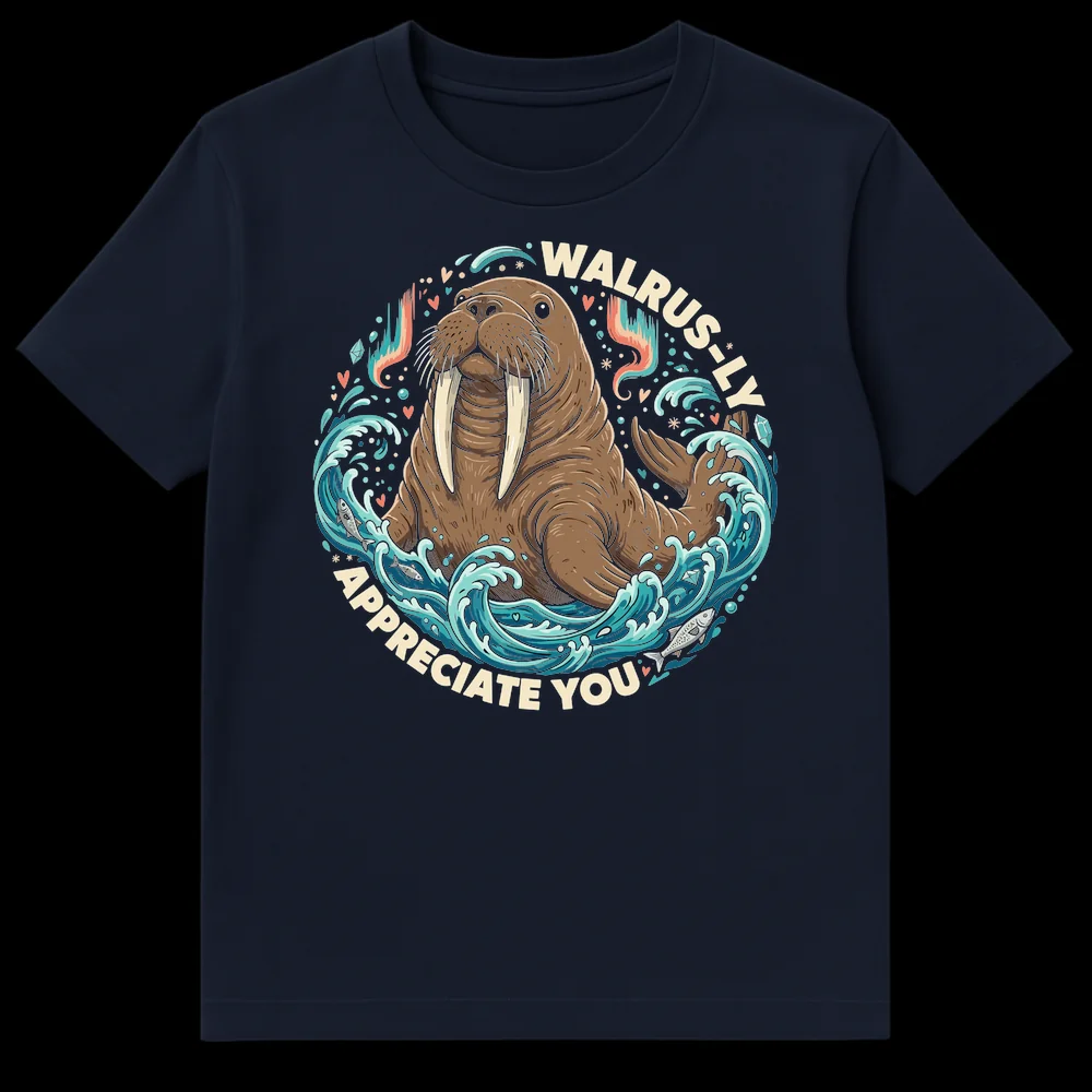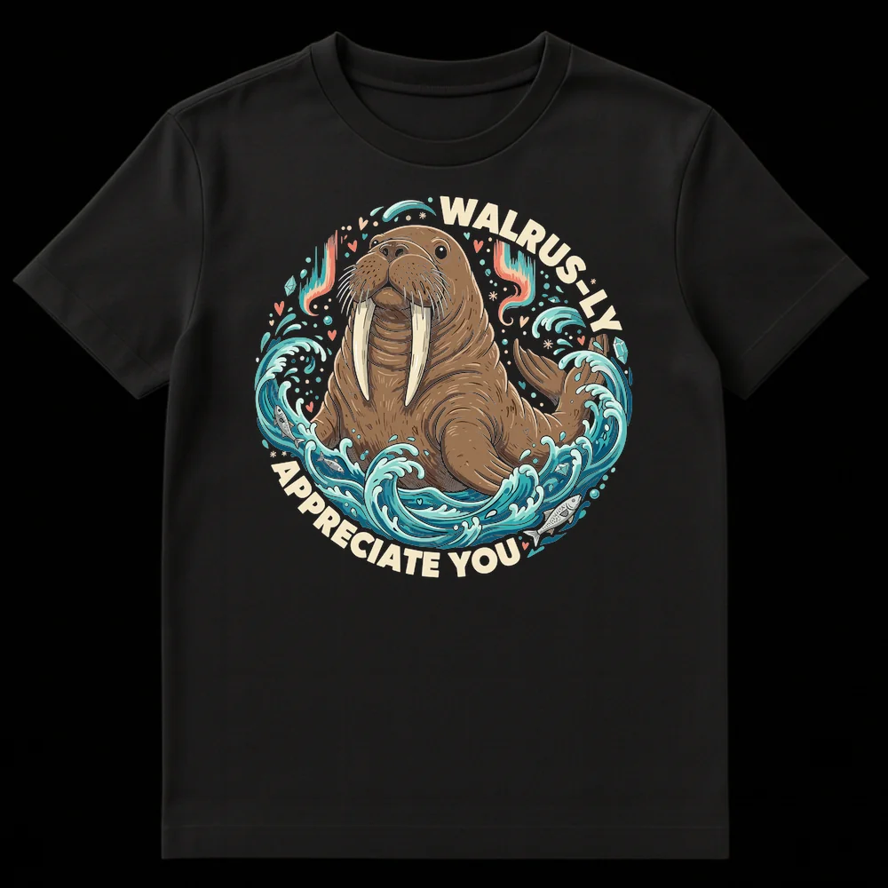 Dive into appreciation with our “WALRUS-LY APPRECIATE YOU” t-shirt! This delightful design showcases a friendly, anthropomorphized walrus emerging from vibrant ocean waves, surrounded by sparkling elements and hints of the Northern Lights. The clever pun playfully substitutes “really” with “walrus-ly,” transforming a sincere message of gratitude into a charming, animal-themed declaration. It’s more than just a shirt; it’s a smile-inducing statement that conveys warmth and affection. Crafted for comfort and style, this tee is perfect for walrus lovers, pun enthusiasts, and anyone who enjoys wholesome, lighthearted humor. Surprise a teacher, thank a friend, or treat yourself to this unique piece of marine life art. It’s a thoughtful gift for birthdays, holidays, or just because you genuinely appreciate someone!
