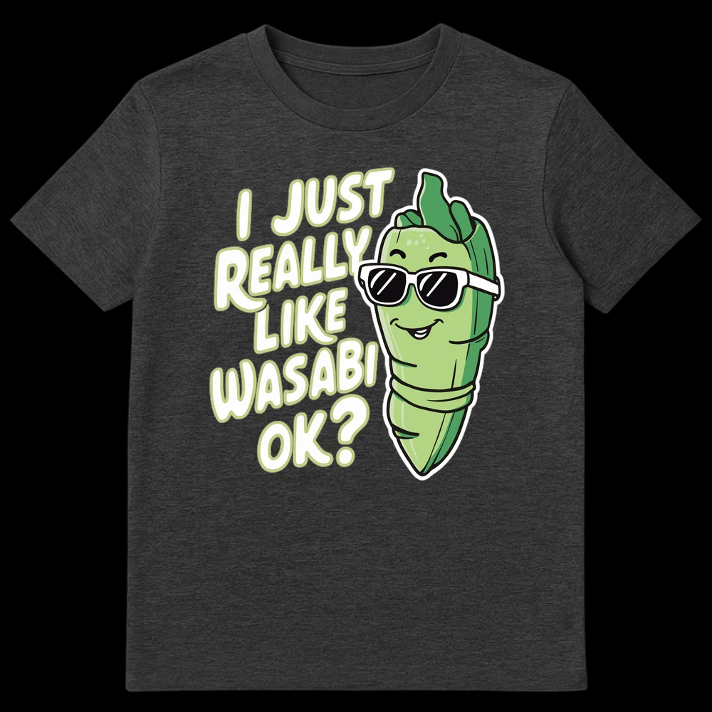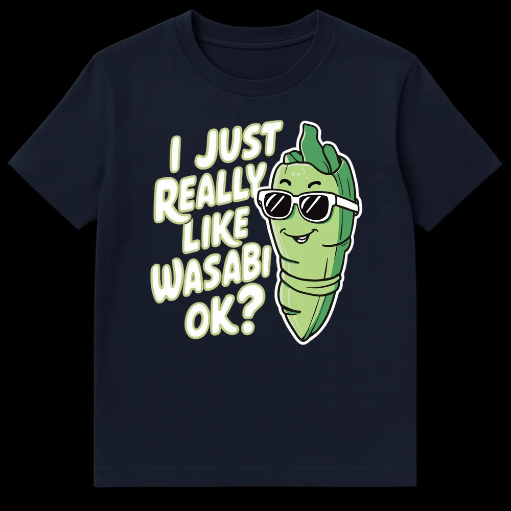Declare your devotion to the delicious heat with our “I JUST REALLY LIKE WASABI OK?” t-shirt. This unique design showcases a charming, personified wasabi character, complete with stylish sunglasses and a smug grin, embodying your bold and unapologetic love for the Japanese condiment. The playful, hand-drawn typography complements the modern cartoon art style, making it a standout piece.