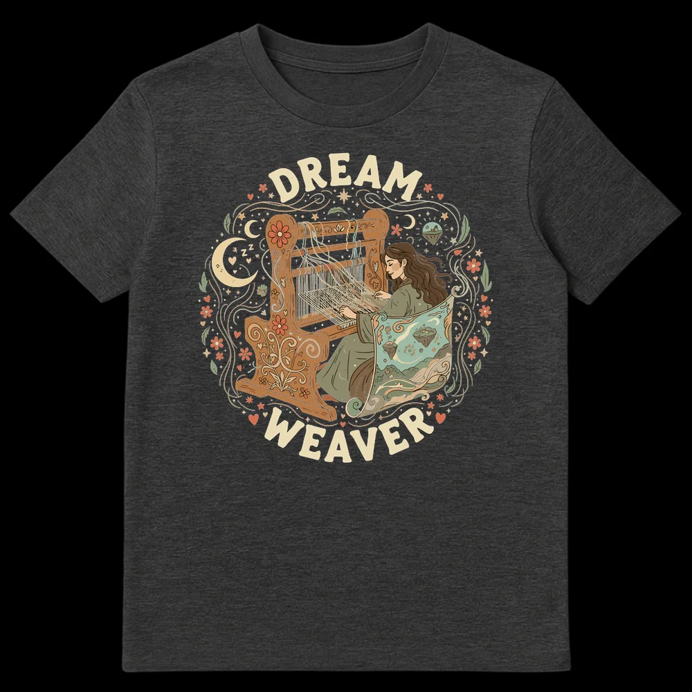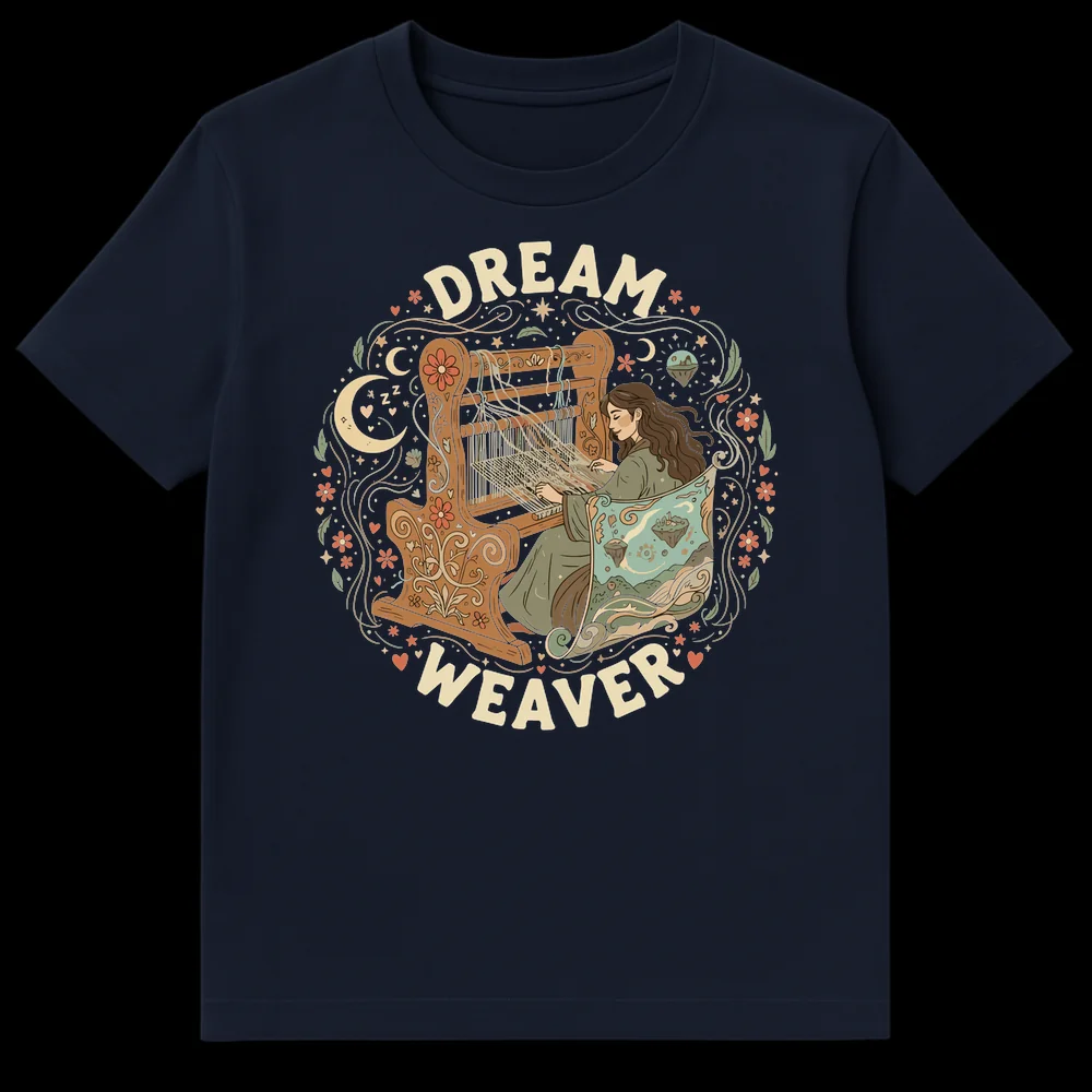 Unleash your inner creativity with our captivating Dream Weaver t-shirt, where a tranquil artisan brings a fantastical world to life on her loom. The design beautifully illustrates the iconic phrase “Dream Weaver,” depicting a woman literally weaving an ethereal landscape complete with floating islands, celestial bodies, and whimsical florals. It’s a powerful visual pun for those who manifest their dreams into reality. This shirt is an ideal present for passionate fiber artists, tapestry weavers, or crafters who appreciate the magic of handmade creation. Its neo-traditional illustrative style, rich earthy color palette, and serene imagery also appeal to fans of fantasy, cottagecore aesthetics, and anyone who cherishes imagination and inner peace. Wear your inspiration and share the wonder of weaving dreams.