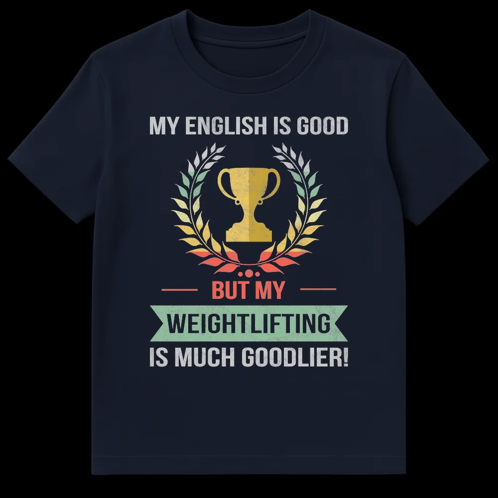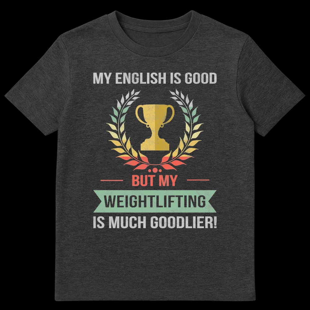 Show off your passion for the iron sport with this humorous weightlifting tee! Featuring the witty phrase “MY ENGLISH IS GOOD BUT MY WEIGHTLIFTING IS MUCH GOODLIER!” alongside a distressed trophy and laurel wreath, this design celebrates strength over perfect grammar. It’s the perfect funny gift for any gym enthusiast, powerlifter, or fitness trainer who appreciates a good laugh and heavy lifts.