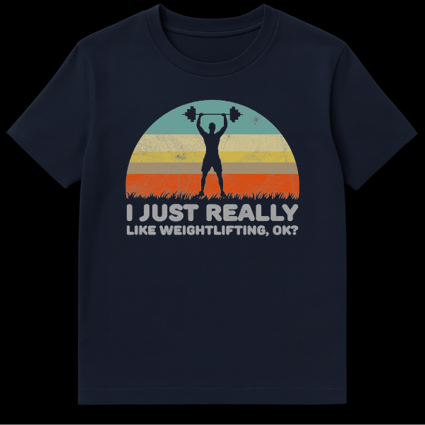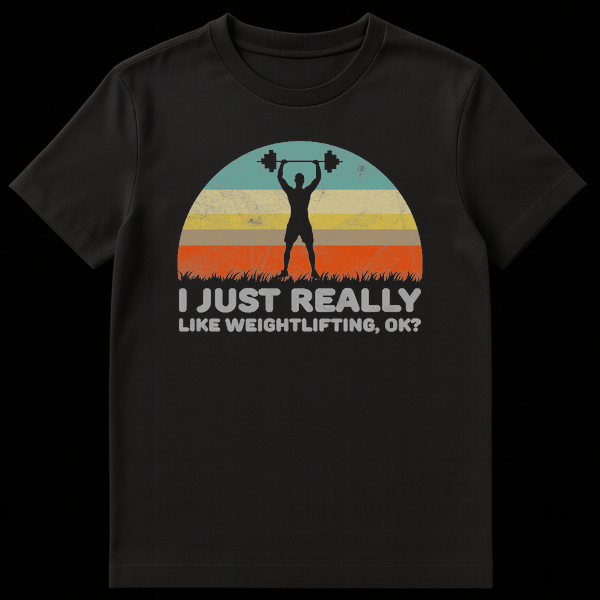 Embrace your passion with this vintage-inspired weightlifting t-shirt. Featuring a striking silhouette of an overhead lift against retro-striped hues, this design perfectly captures the dedication of any lifter. The relatable text, “I JUST REALLY LIKE WEIGHTLIFTING, OK?” expresses a universal sentiment among fitness enthusiasts. It’s the perfect gift for anyone who lives for the gym and appreciates a cool, retro aesthetic.
