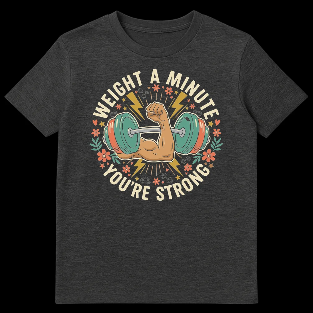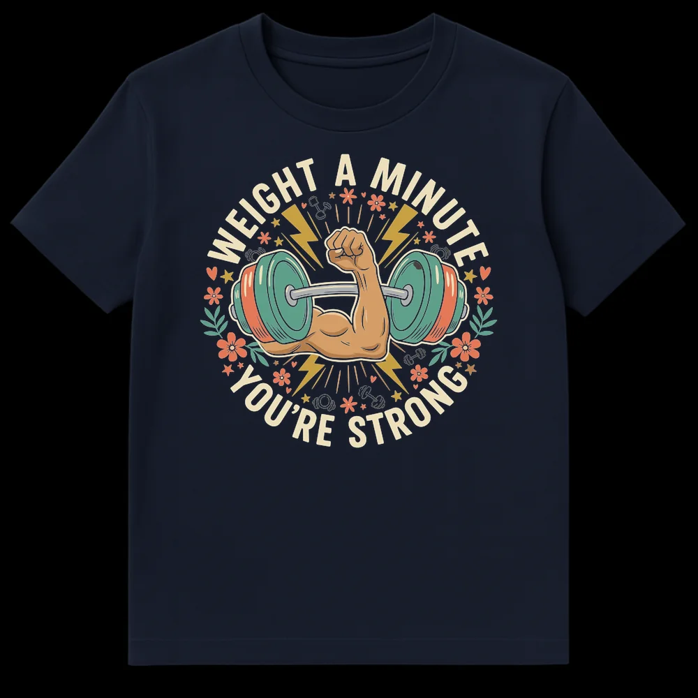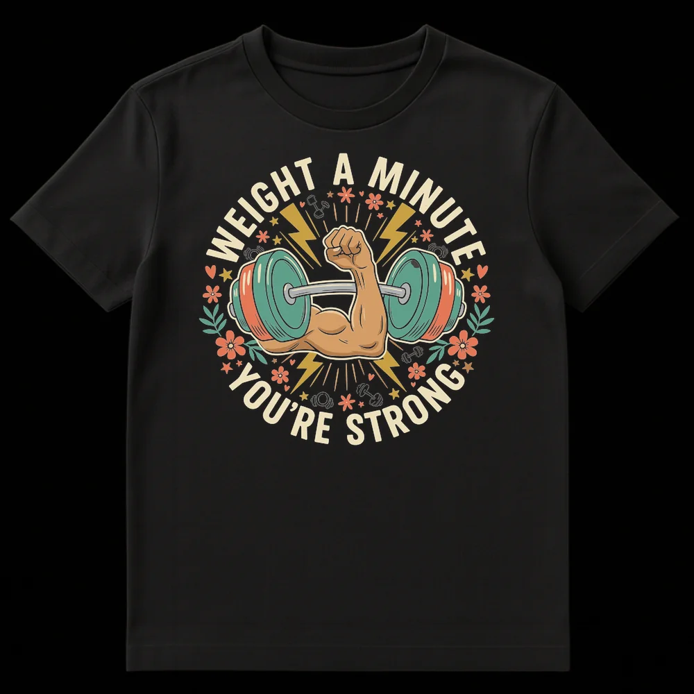Unleash your inner powerhouse with our ‘WEIGHT A MINUTE YOU’RE STRONG’ T-shirt, a must-have for every fitness enthusiast! This unique design masterfully combines a humorous play on words with a bold, retro-inspired cartoon illustration of a flexed bicep lifting a dumbbell. The phrase ‘WEIGHT A MINUTE’ brilliantly twists the common idiom into a clever nod to weight training, while ‘YOU’RE STRONG’ delivers an empowering and affirming compliment. Adorned with playful stars, lightning bolts, and subtle floral accents in a warm, earthy palette, this tee is a stylish and fun way to show off your dedication to the gym. It’s the ideal conversation starter and a fantastic gift for weightlifters, bodybuilders, gym-goers, or anyone who appreciates a good pun and a strong physique. Celebrate strength, humor, and motivation all in one eye-catching, comfortable tee.
