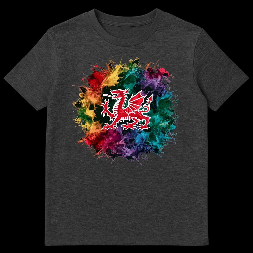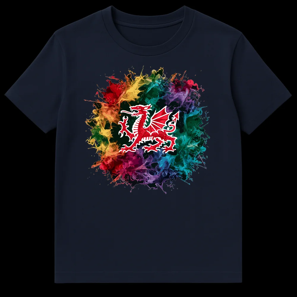 Celebrate your Welsh heritage with this striking t-shirt featuring the iconic Red Dragon (Y Ddraig Goch) set against an explosive, multi-colored ink splash background. This design offers a fresh, modern twist on a traditional national symbol, making a bold statement of Welsh pride. It’s the perfect gift for anyone who loves Wales, its rich culture, or supports Welsh sports.