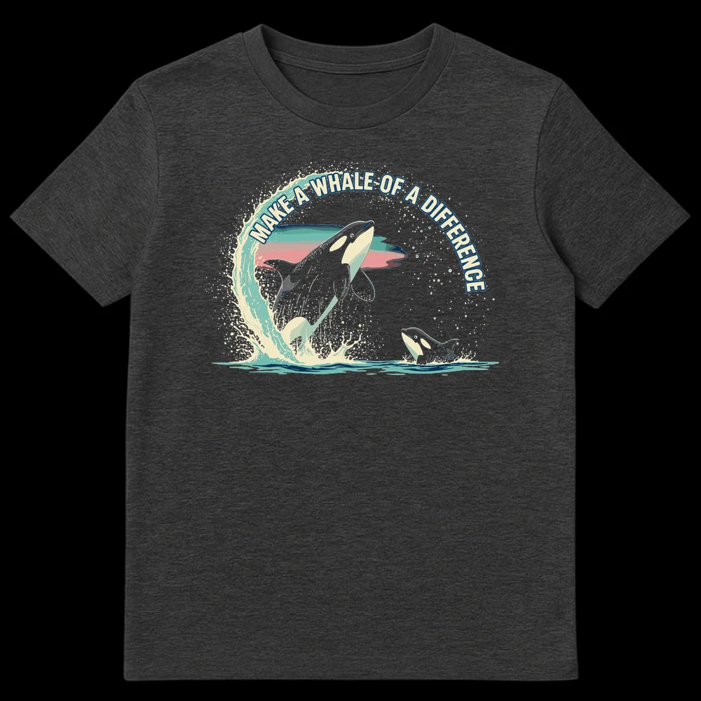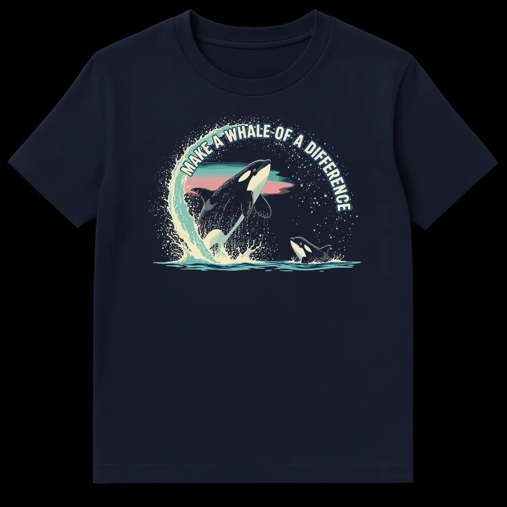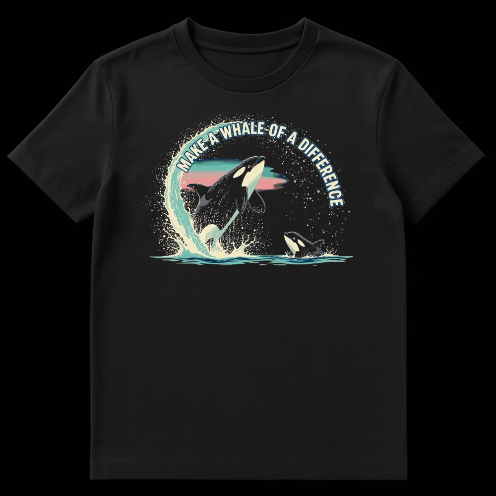 Embrace the spirit of change with our captivating “Make A Whale Of A Difference” t-shirt. This design brilliantly transforms a beloved idiom into a visual masterpiece, showcasing two magnificent orcas, one adult and one calf, dynamically breaching from the ocean. The phrase itself becomes a clever pun, literally depicting whales making a profound impact within their stunning aquatic world.