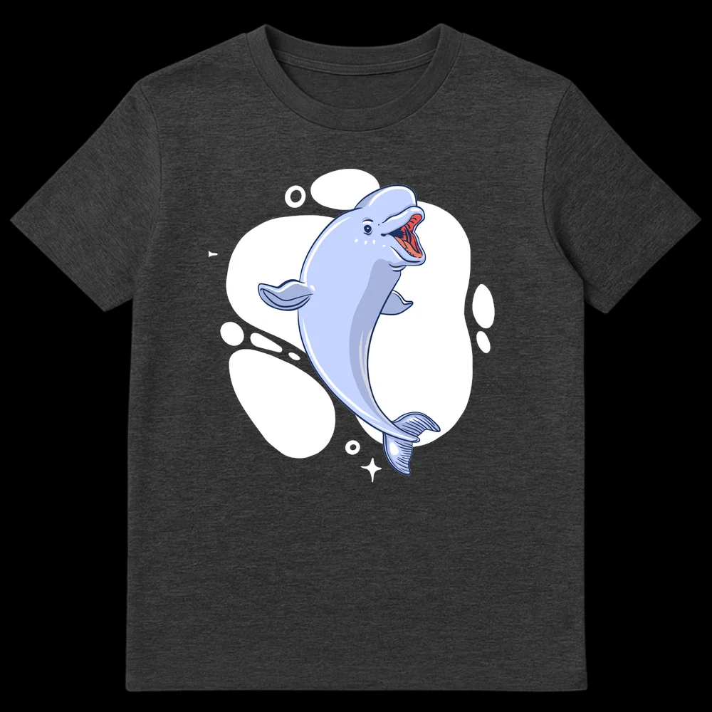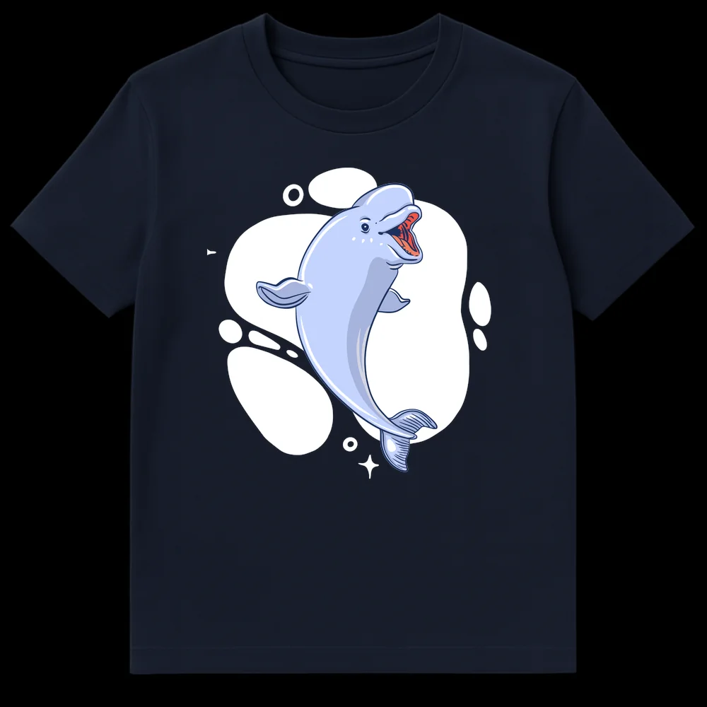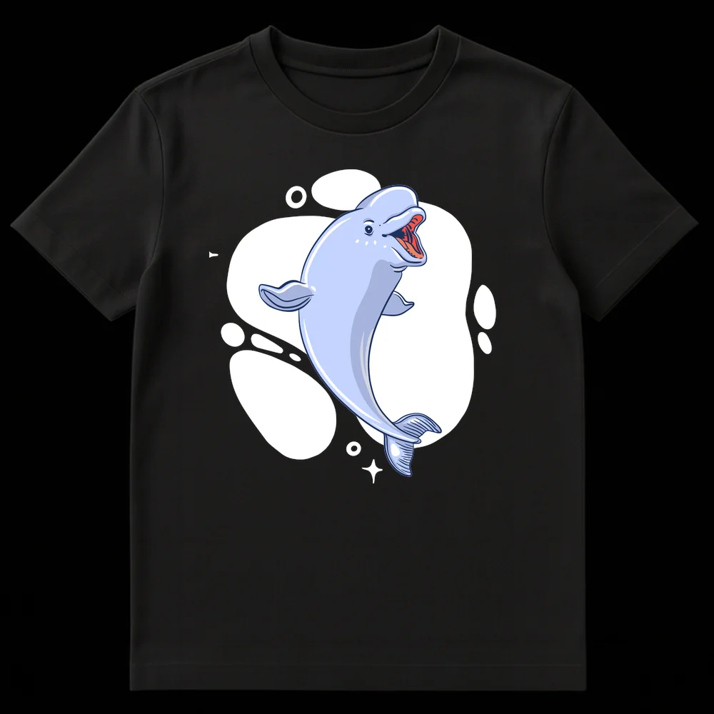 Celebrate the charm of the sea with our adorable singing beluga whale t-shirt. This design captures a cheerful beluga in a modern cartoon style, complete with dynamic water splashes and a vibrant color palette. It’s a perfect blend of whimsy and admiration for marine life, evoking joy and playfulness. An ideal gift for ocean enthusiasts, animal lovers, or anyone who appreciates cute and uplifting designs.