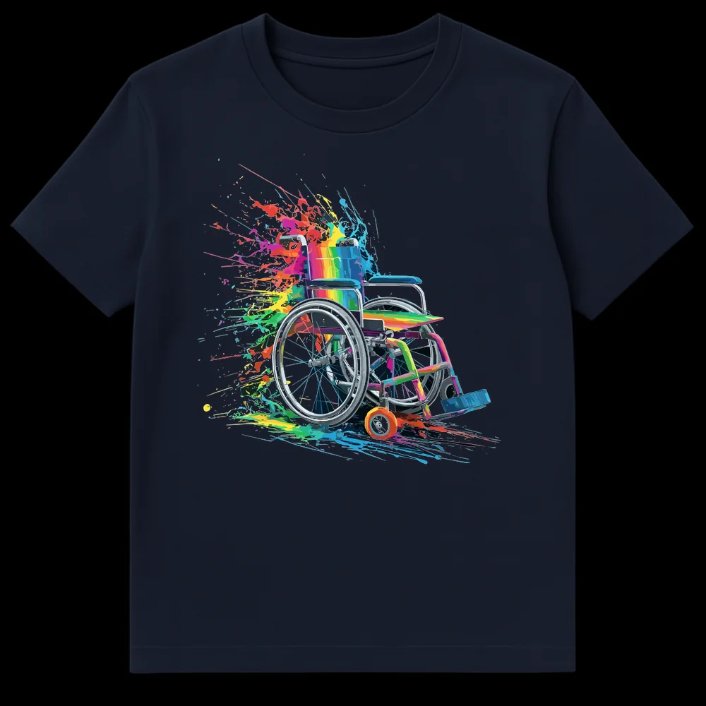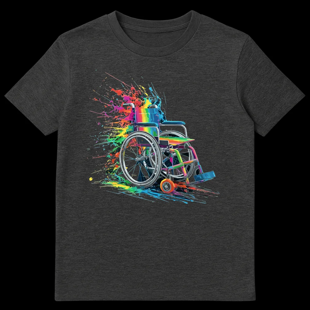 Celebrate life and movement with this empowering t-shirt featuring a vibrant wheelchair in a dynamic rainbow paint splatter design. This unique piece symbolizes energy, inclusivity, and breaking barriers, transforming the wheelchair into a powerful statement of a colorful, active existence. It’s a perfect gift for wheelchair users, disability advocates, or anyone who champions diversity and joyful self-expression.