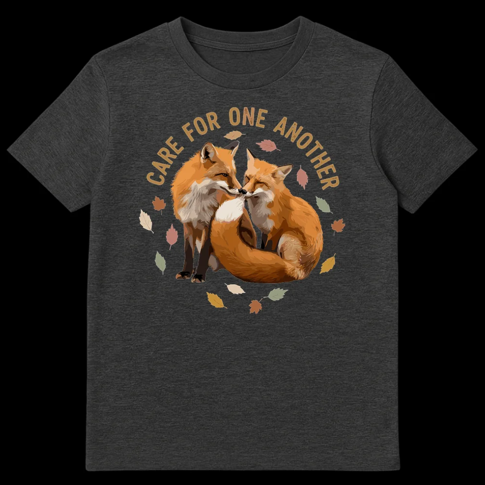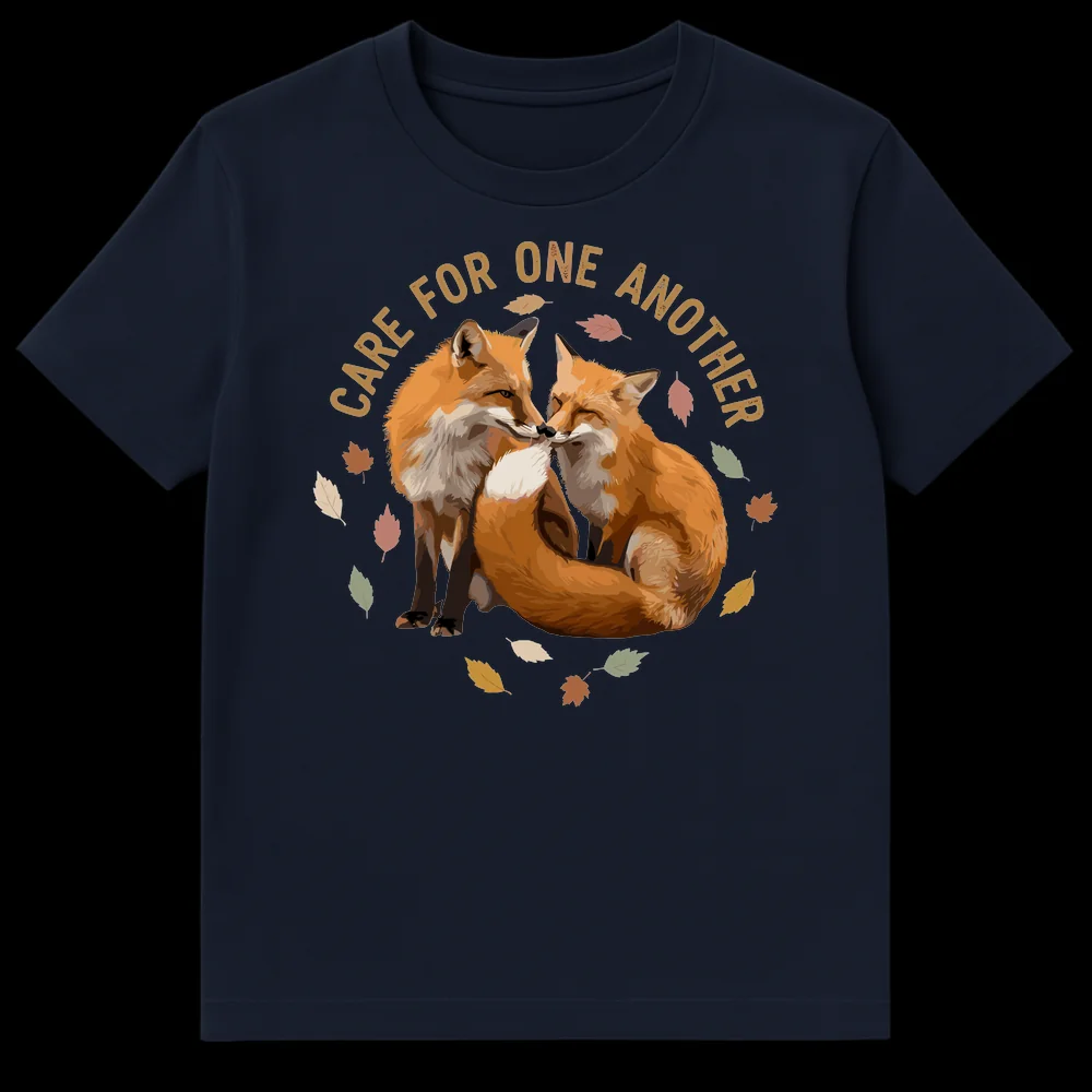 Tags: Animal Connection Wear, Autumn Leaves Design, Care For One Another, Empathy Message Tee, Forest Wildlife Top, Foxes Nature Shirt, Kindness Animal Clothing, Mutual Support Shirt, Nature Advocate Gift