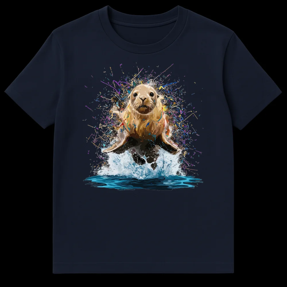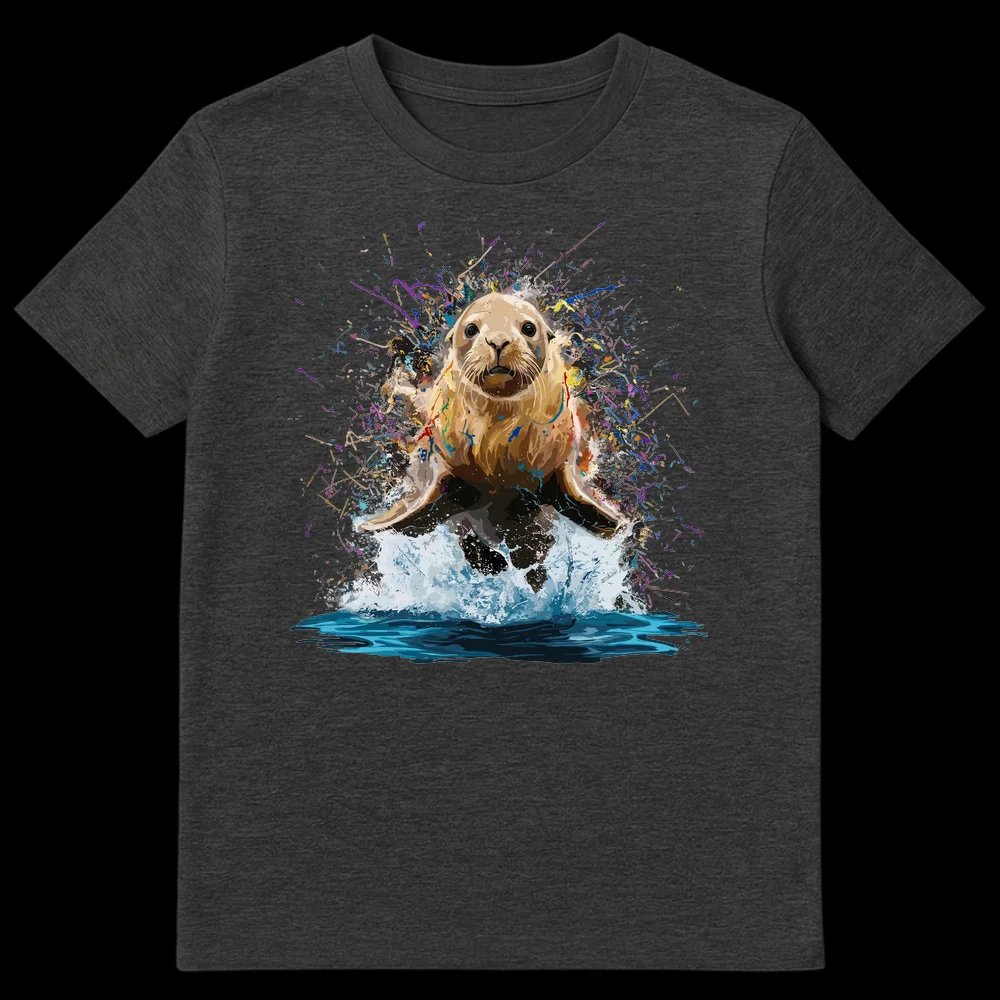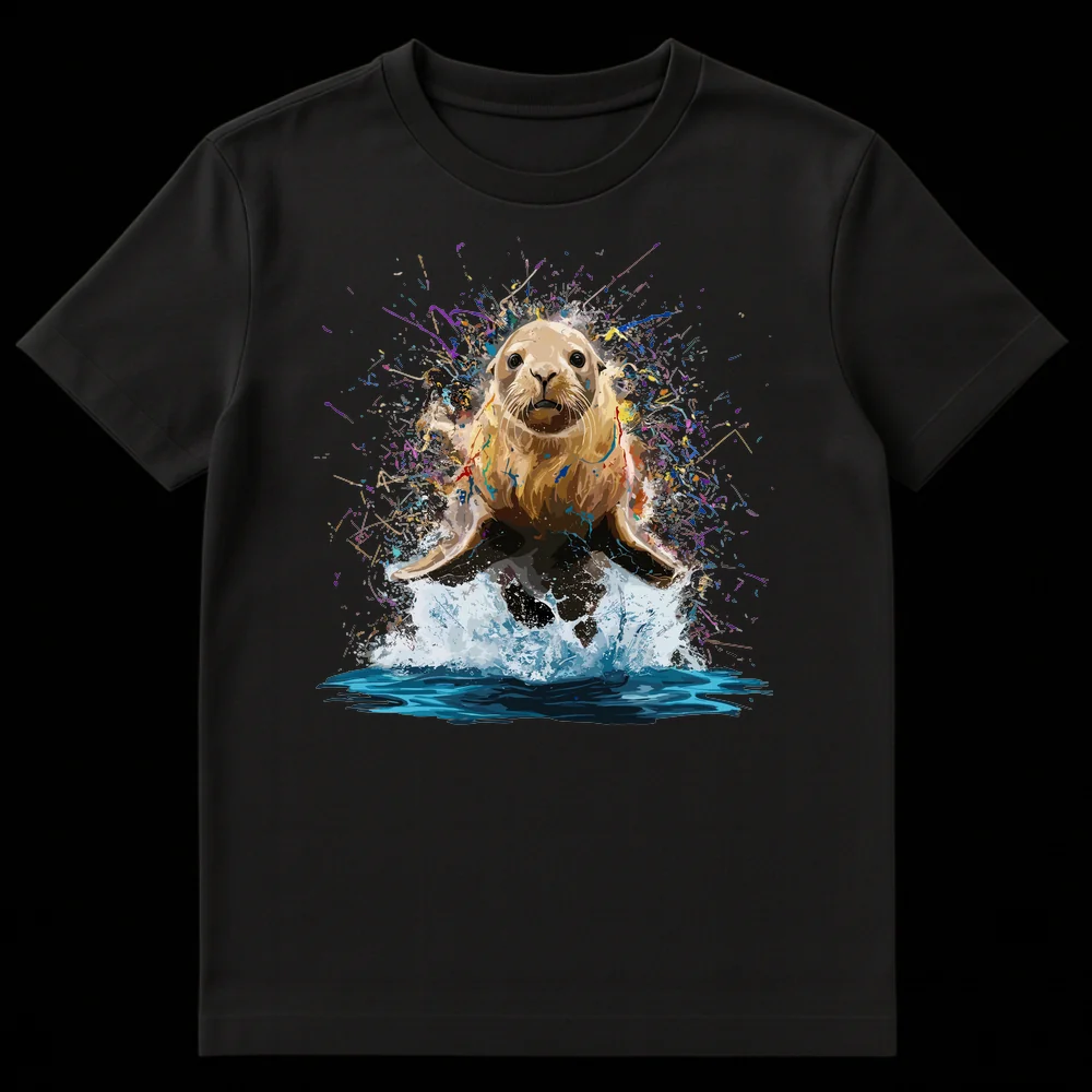 Experience the captivating energy of the ocean with our unique Dynamic Sea Lion Splash T-Shirt. This design isn’t just clothing; it’s a wearable piece of art, showcasing a majestic sea lion rendered in incredible detail, bursting forth amidst an explosion of colorful abstract splashes. The vibrant purples, blues, greens, and reds stand out brilliantly against the rich black background, creating a visually striking and energetic masterpiece. Perfect for wildlife enthusiasts, art lovers, or anyone who values expressive, bold graphics, this tee embodies joy, wonder, and the untamed spirit of nature. It makes an ideal, thoughtful gift for birthdays, holidays, or just to celebrate someone’s love for marine animals and modern art, allowing them to carry a piece of dynamic beauty wherever they go.