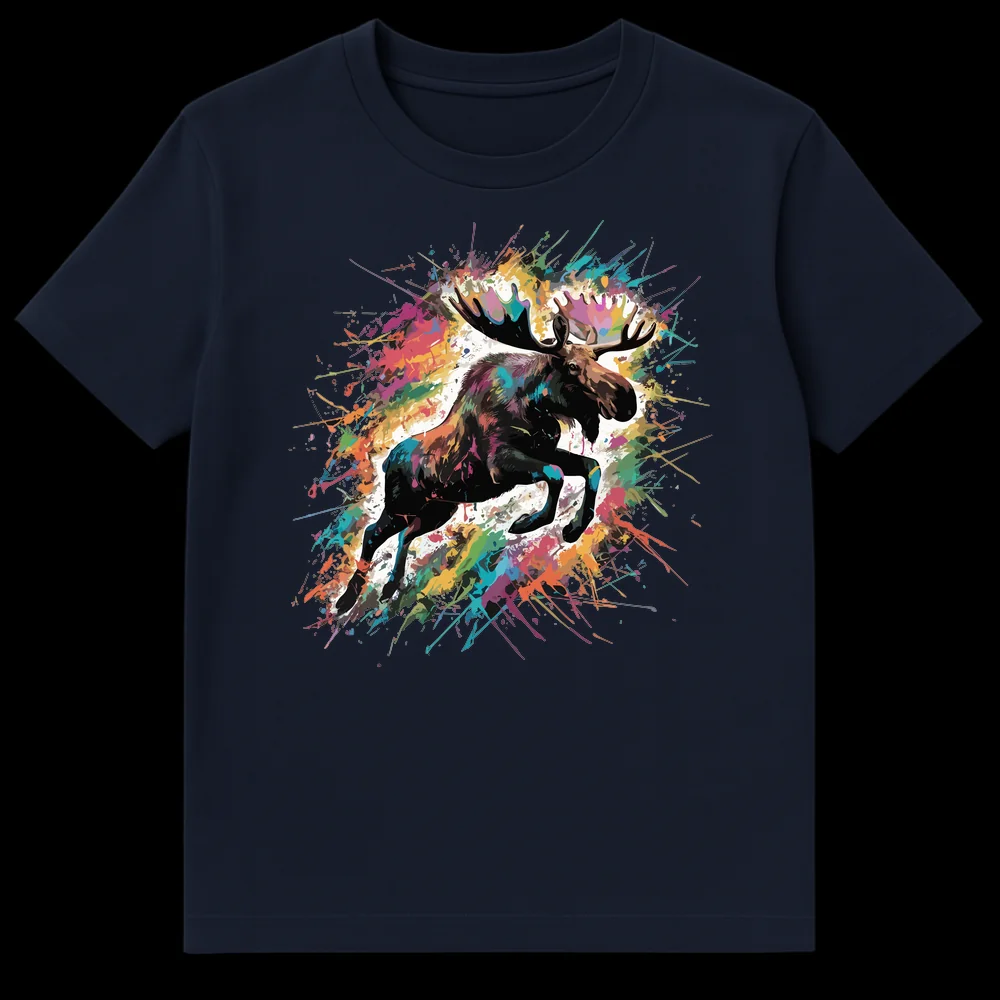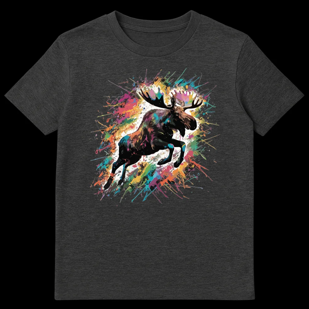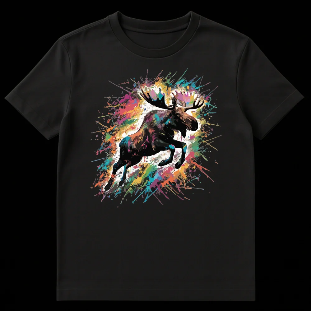 Embrace the wild with our vibrant “Splash Art Moose” t-shirt. This unique design captures a majestic moose in a dynamic leap, exploding with a rainbow of energetic paint splatters against a deep black background. It’s a powerful and artistic statement piece perfect for nature lovers and anyone who appreciates bold, expressive animal graphics.